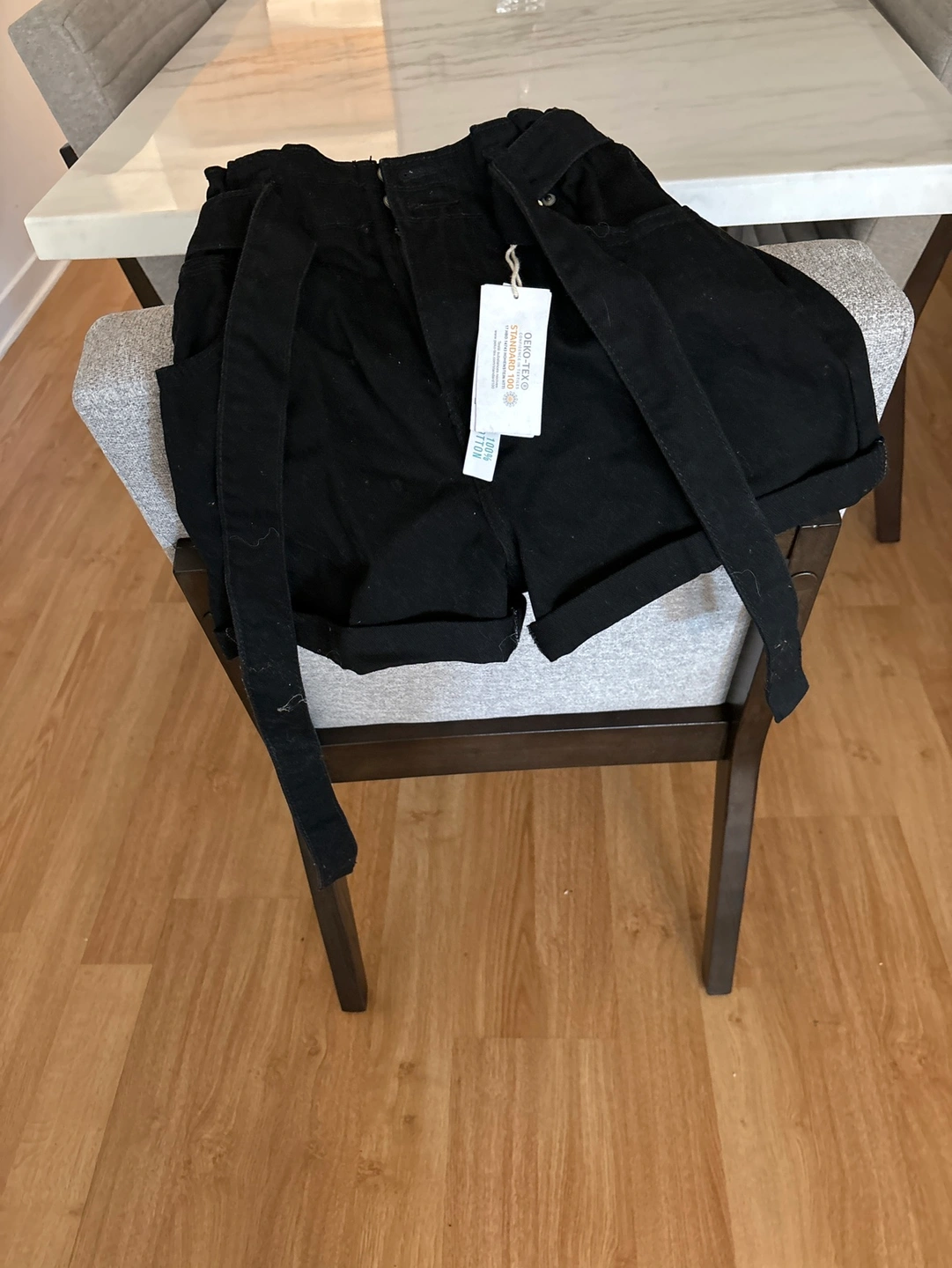 Black high waisted shorts with a built in belt. The shorts are made of a soft denim-like material. The shorts are a size large. There is a tag in the shorts which says "Oeko-Tex Standard 100" and "100% Cotton".