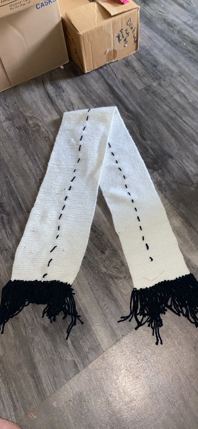 White scarf with black fringes and stitching. The scarf is long and thin.