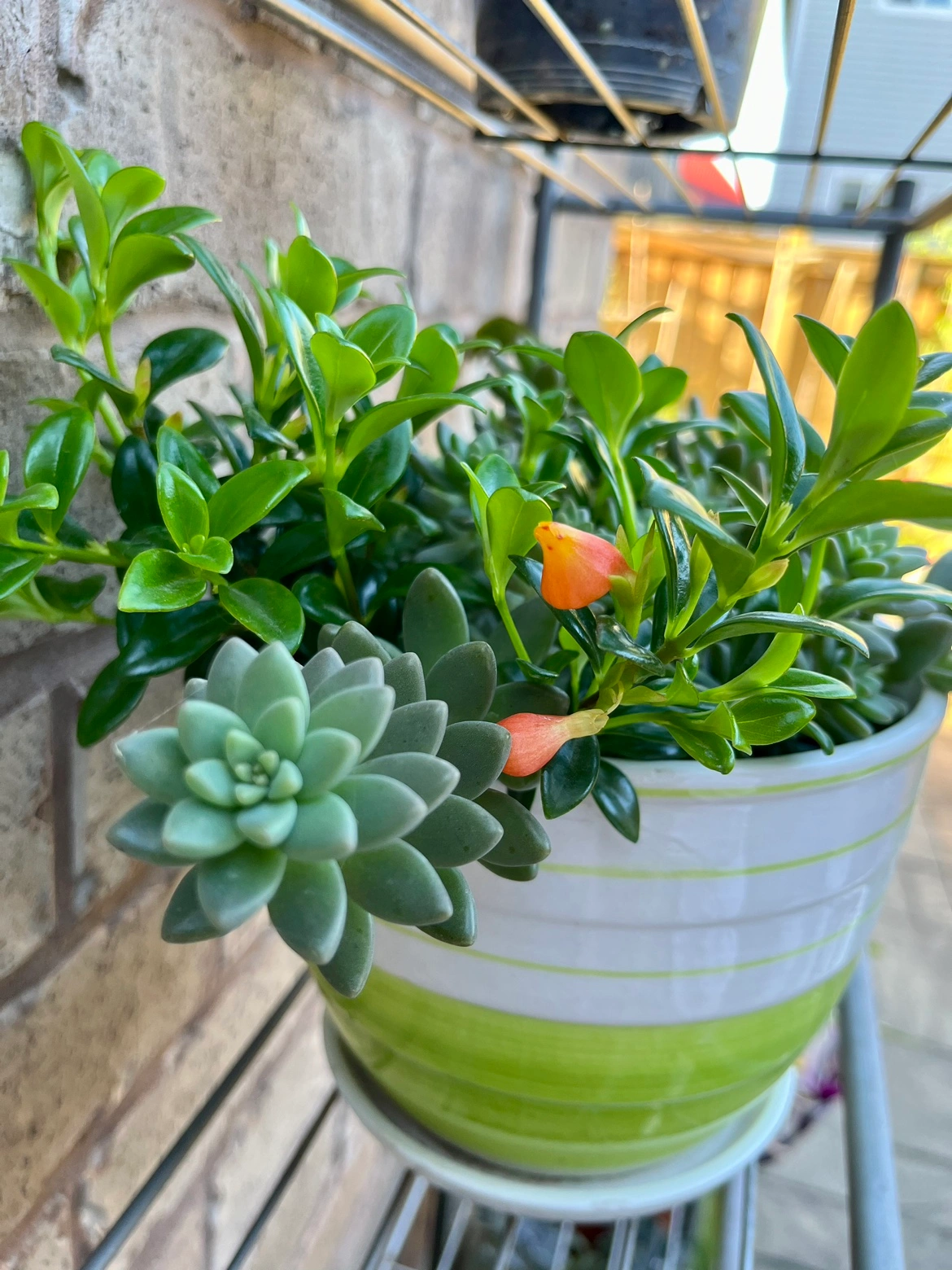 This plant has green leaves and orange flowers. It is in a white and green pot.