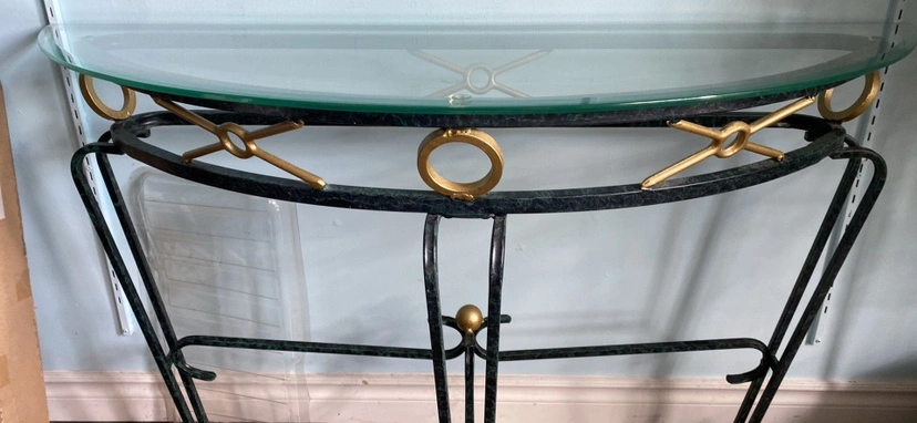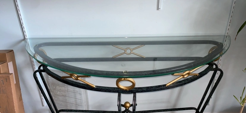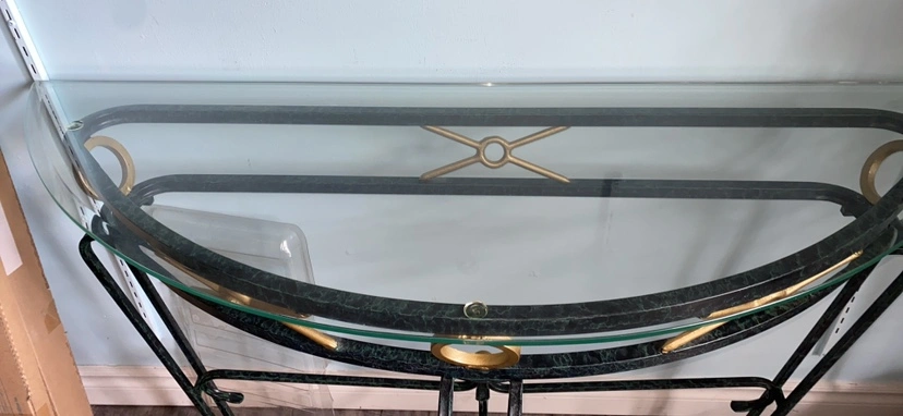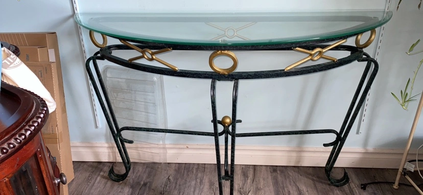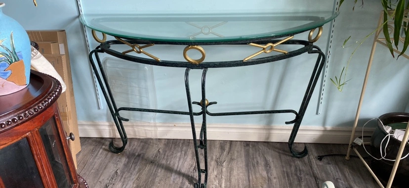 This console table has a glass top and an ornate wrought iron base. The table has a curved front and two shelves. The base is a dark green colour with gold accents. Never used. Been sitting in corner. Selling need space Paid $450 for it