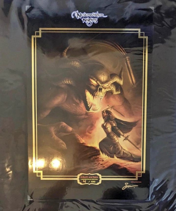 Dungeons and Dragons: Aribeth and Balor by Mike Sass Official BioWare Artist for Neverwinter Nights 4/100 Limited Edition Gold Foil Print 17" x 11" "A pioneer in the video games industry, Mike previously had a long career as legendary developer BioWare's first artist, and for 12 years illustrated for some of the top RPG video games of all time. Mike's experience at BioWare creating box art, magazine covers, concept art and marketing illustrations allowed him to seamlessly transition in 2009 to pursue his true passion of fantasy illustration and oil painting. As a freelance artist, Mike has illustrated RPG and card art for the gaming industry's top franchises, including Magic the Gathering, Hearthstone, Star Wars, Pathfinder and Dungeons and Dragons. As one of a rare few gaming artists who paints in traditional media, Mike combines commercial art with his love for the craft of painting. Mike's work has appeared in the Spectrum annual, as well as featured in magazines such as ImagineFX and Fantasy Art (China). Recently, Mike's success in painting traditionally has led to exhibiting in 2013 and 2014 at the Allentown Art Museum in the Illuxcon salon. Illuxcon is an annual juried celebration of the best in imaginative realist art. Additionally, in 2014, Mike was a finalist for the prestigious International ARC Salon Competition in the imaginative realism category. In 2018, Mike released a large, 2-disc DVD on his painting techniques, available through his site, select stores and on Amazon Prime video."
