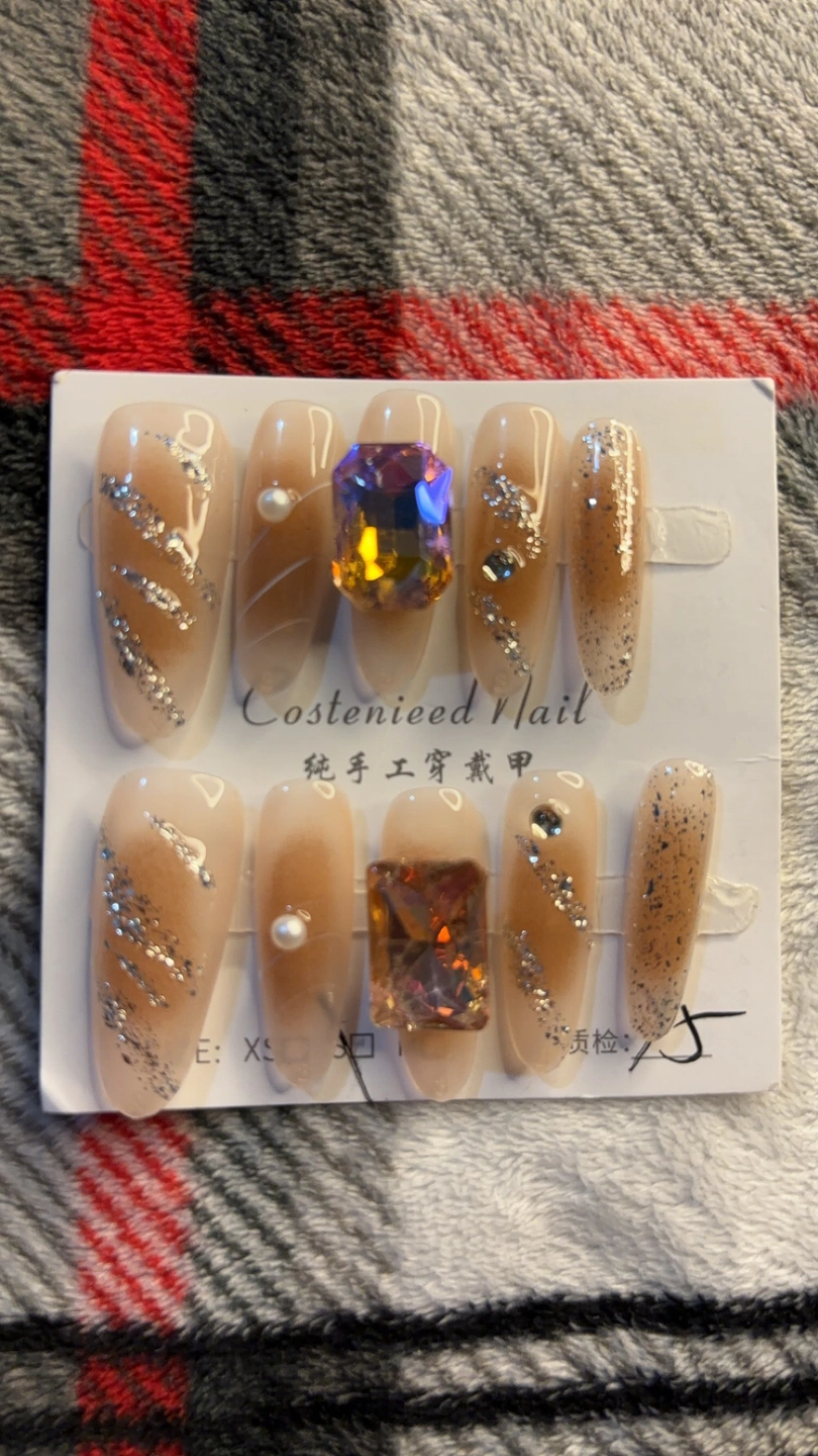 Set of 10 full cover press on nails, in a light nude colour, featuring a silver glitter detail and gemstone accent. It is Brand New ❤️ Accessories included- Press on Stickers and Filer.