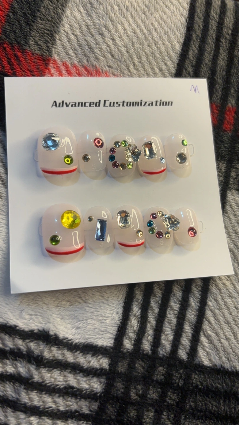These press on nails feature a white base with a red accent line and various gems. Brand new with Accessories Press on Stickers and Filer
