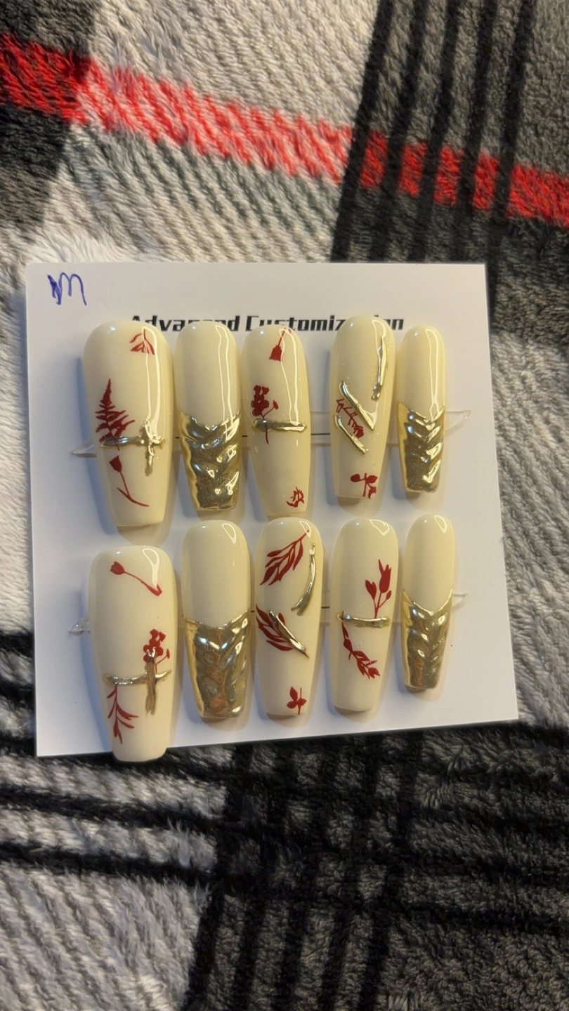 Set of 10 press on nails with gold and red detail. They are long coffin shaped and fit a medium sized hand. Brand new with Accessories Press on Stickers and Filer