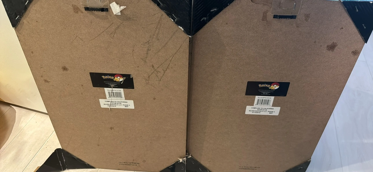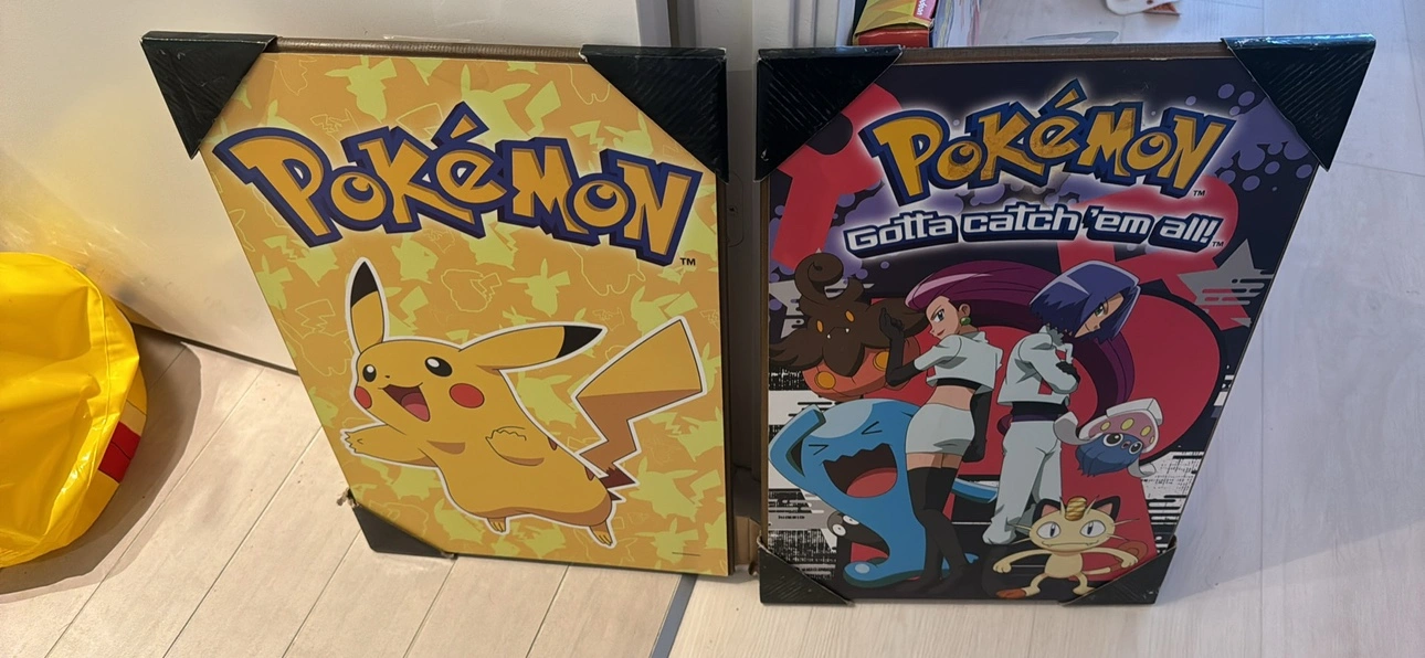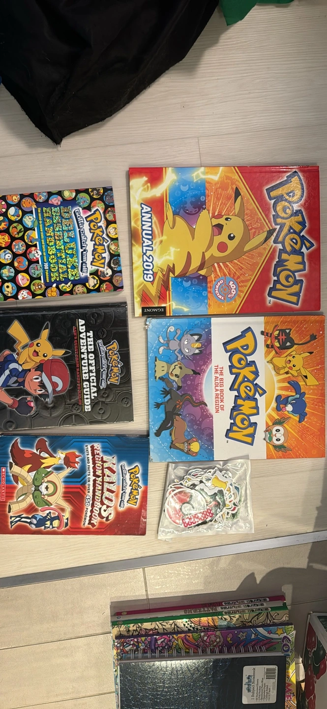 A lot of Pokemon books, stickers, and two wooden posters.