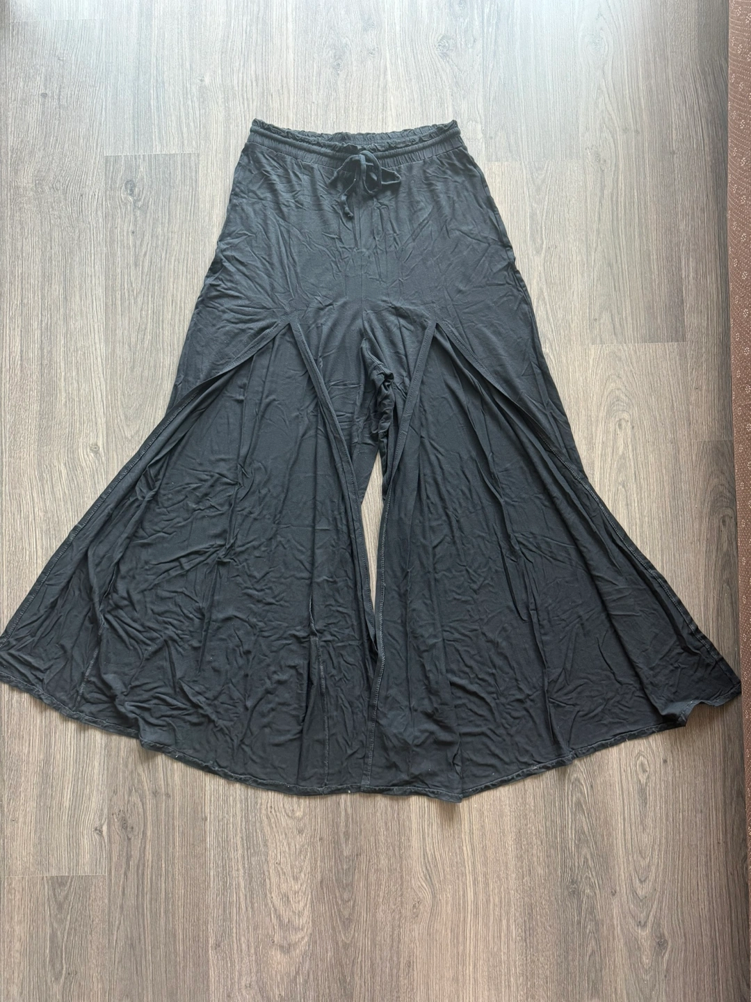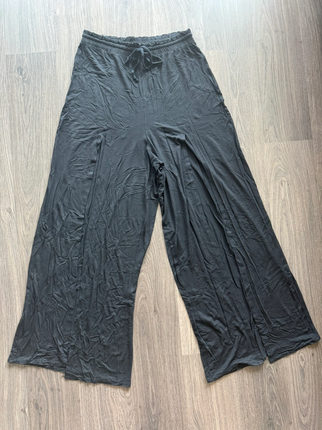 These are a comfortable pair of black wide-leg pants with a drawstring waist and front slits. They are a great option for casual or sexy wear.