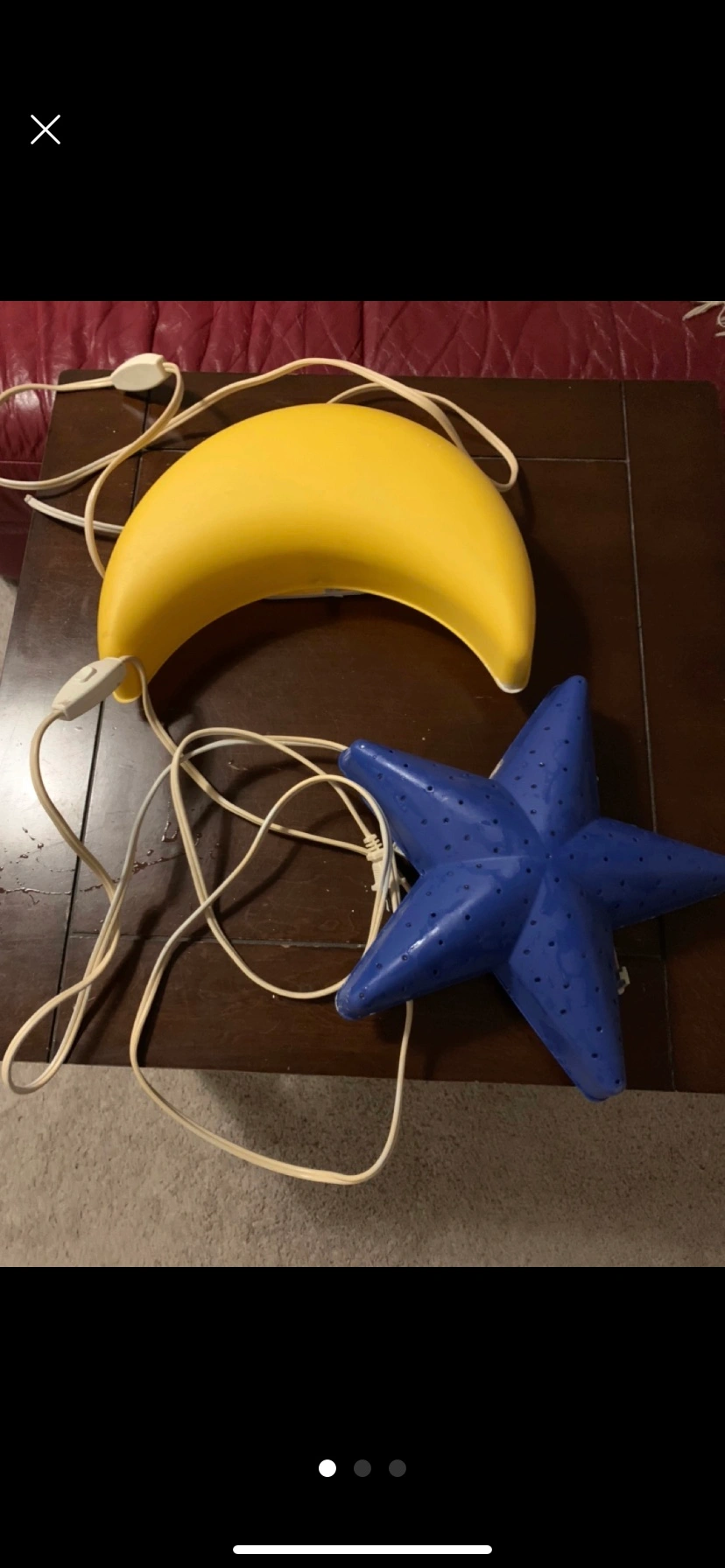 Two plastic night lights, one shaped like a crescent moon and the other a star. They both have a hole in the bottom for a lightbulb and a cord. They are yellow and blue respectively. There is an on/off switch on the cord. Both are in good condition and were stored in a smoke-free home.