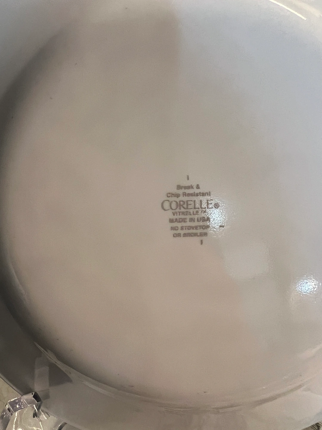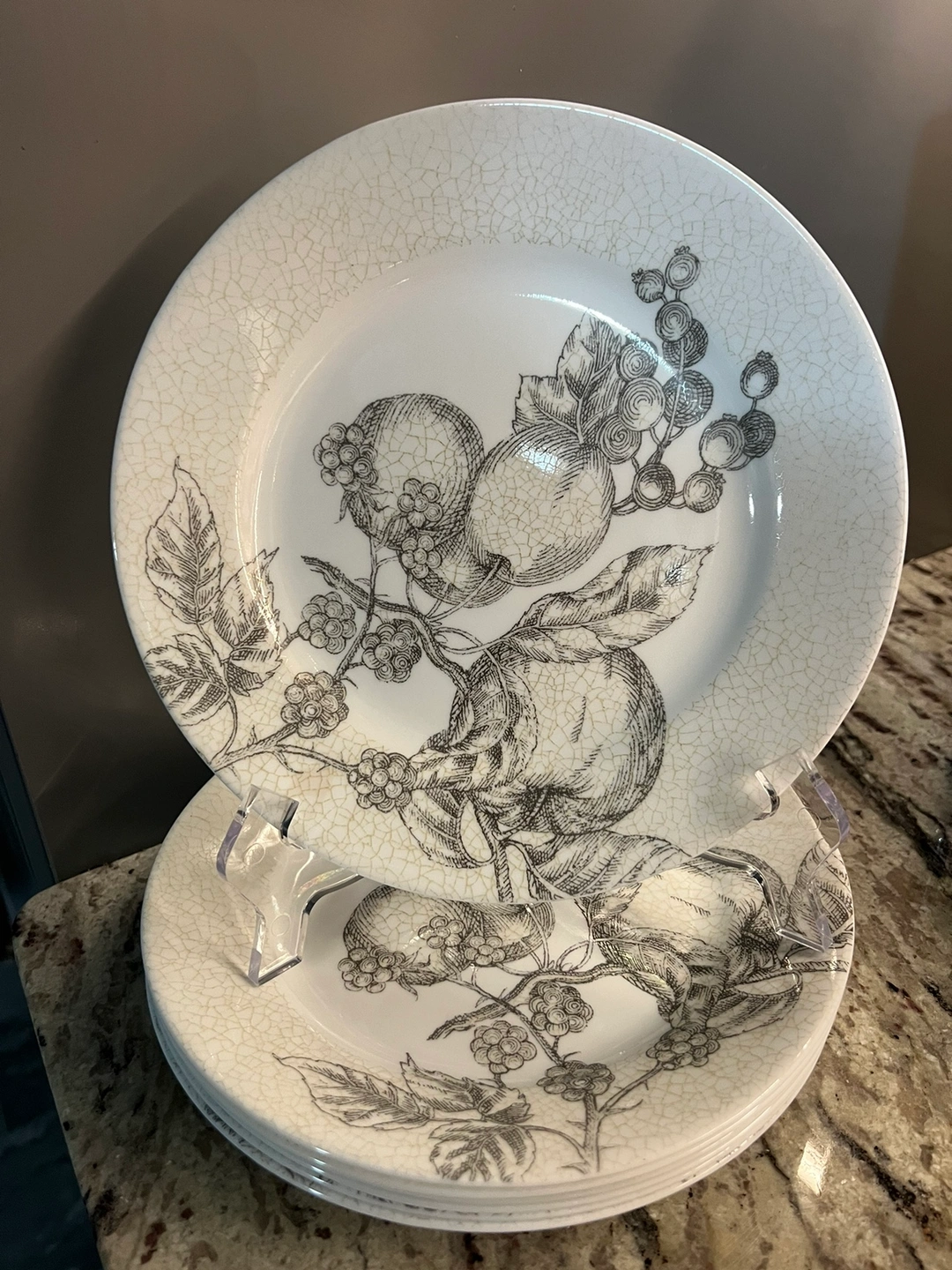 Set of 6 Corelle dinner plates featuring a black and white fruit design.
