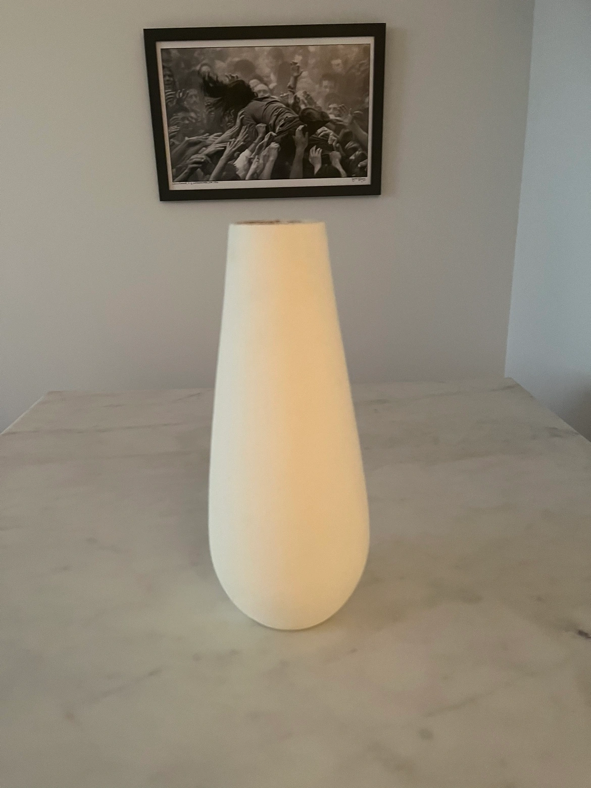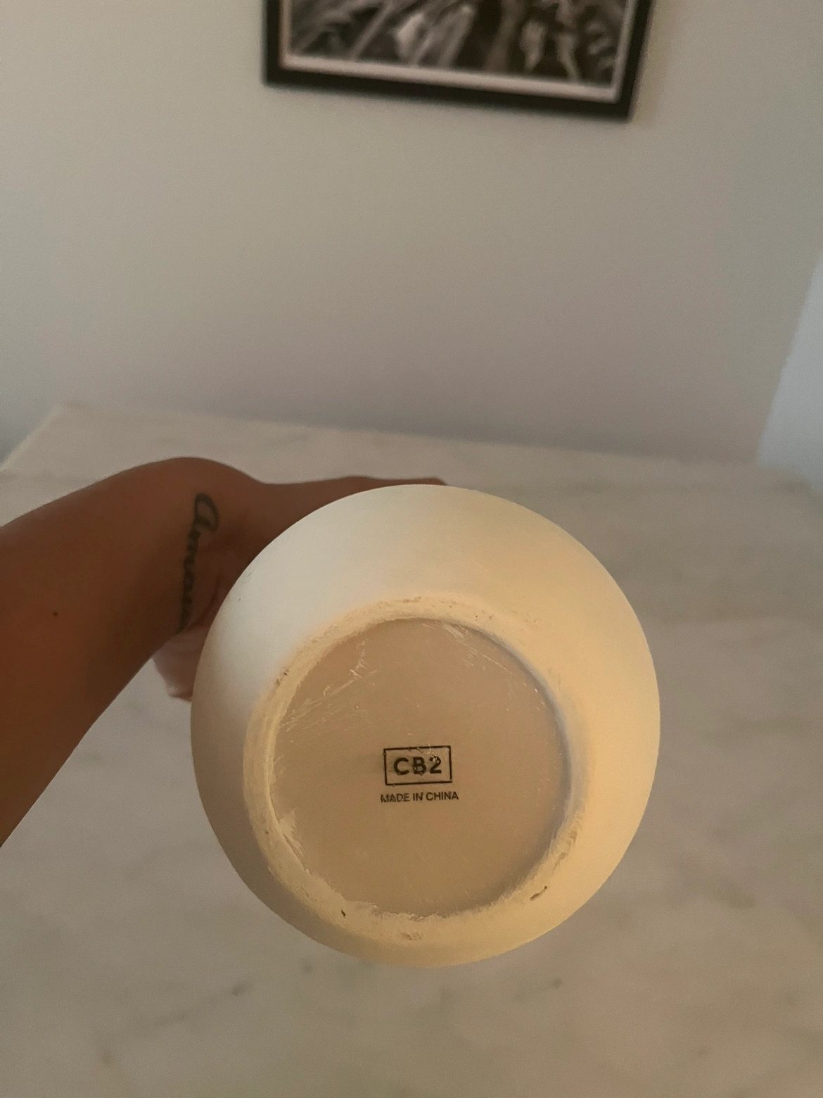 CB2 tall, slender vase made of ceramic. It has been repainted white and has a rounded bottom.