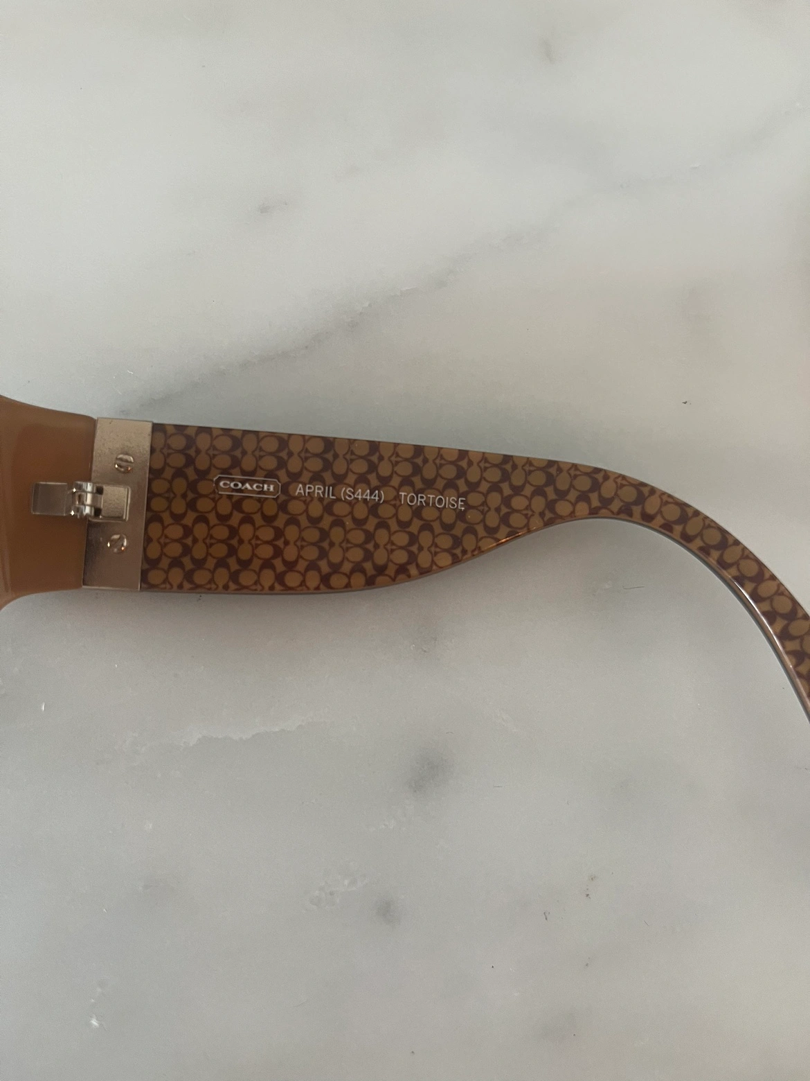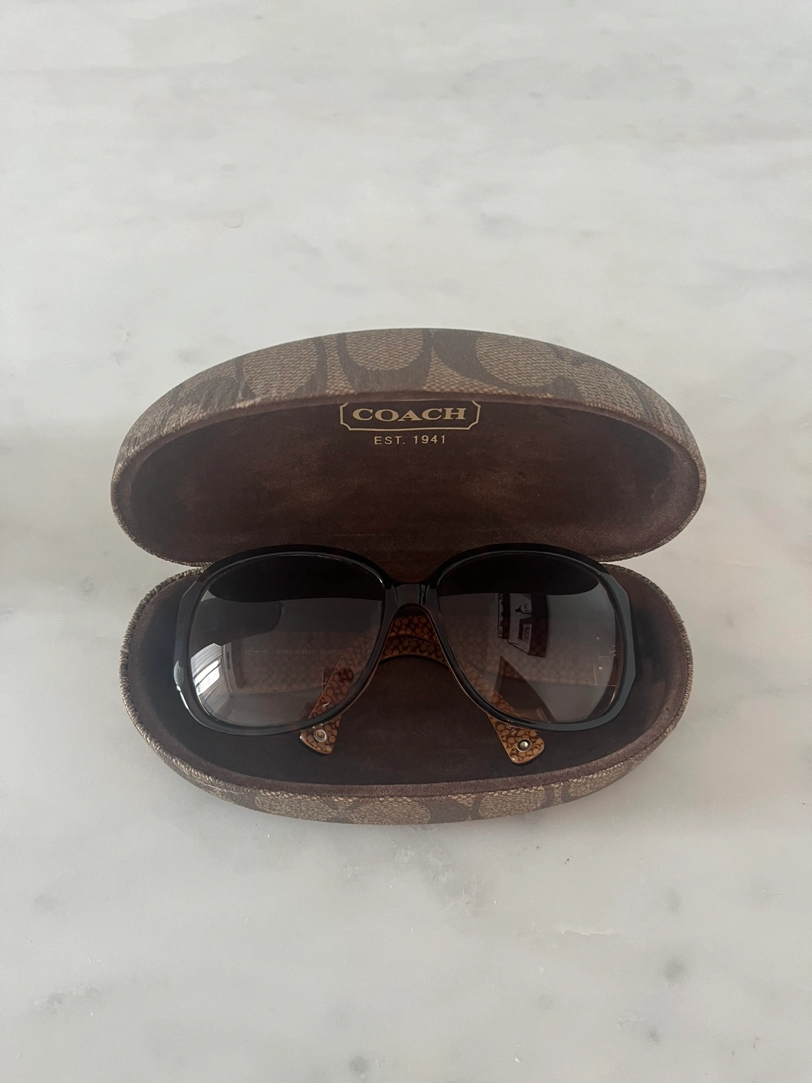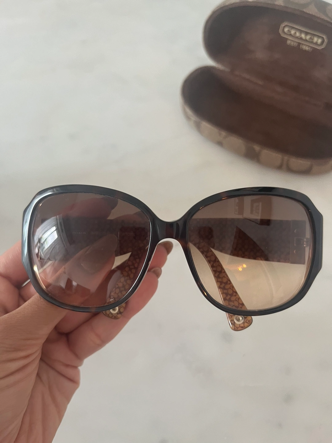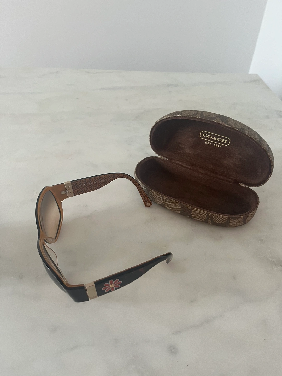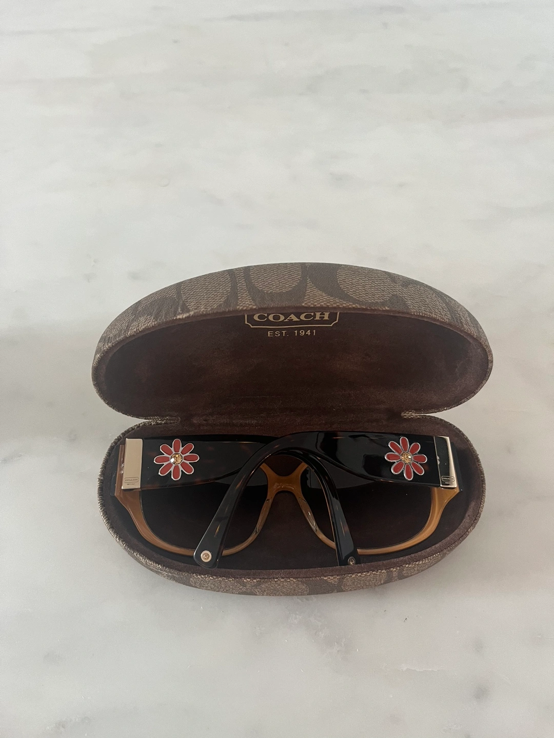 Tortoise brown square frame Coach sunglasses with flower details on arm. Comes with a case.