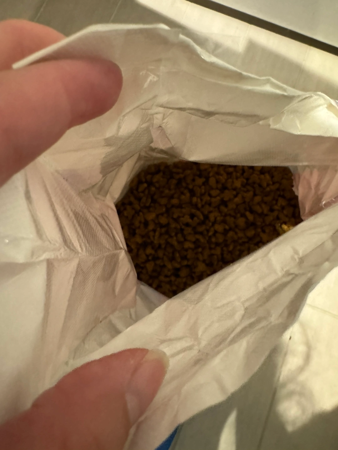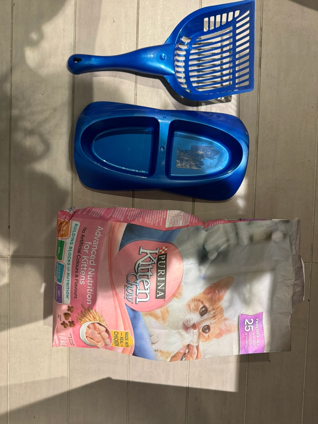 A bag of dry cat food that only a few small scoops was taken out. Comes with bowl and litter scoop as well.