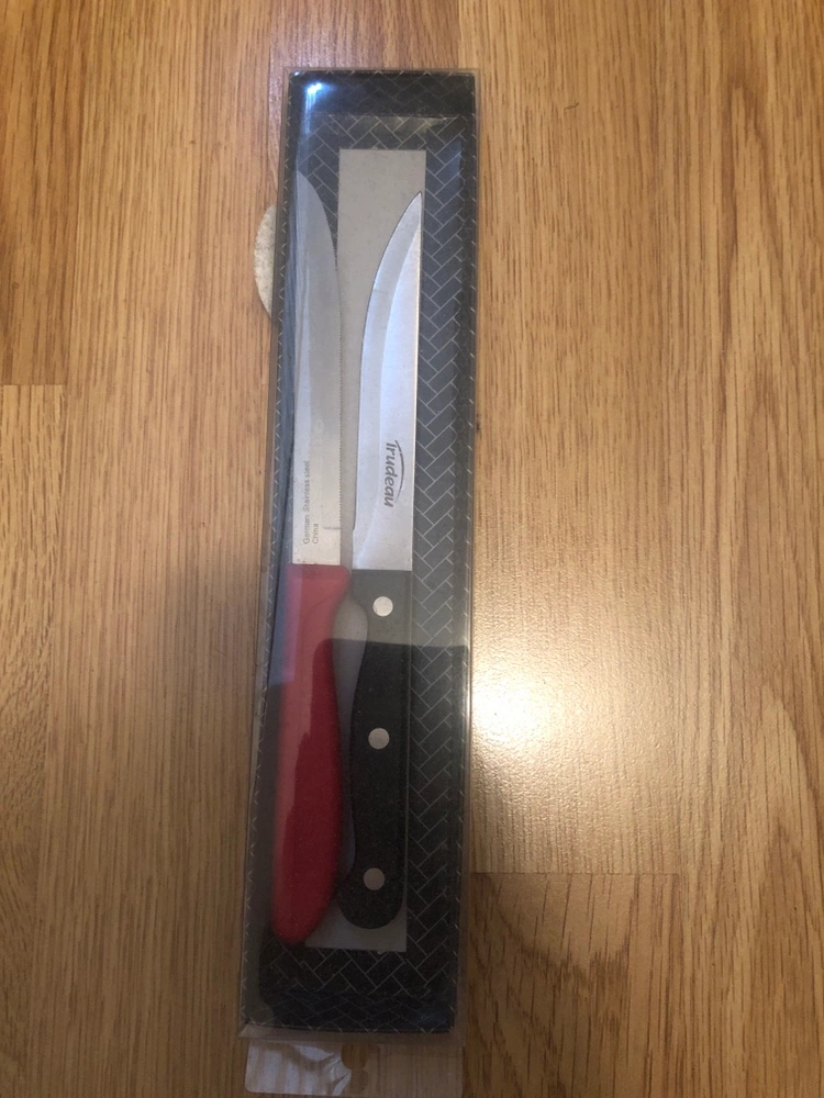 Set of two knives in a box. One knife has a black handle and the other has a red handle. The knives are made of stainless steel.