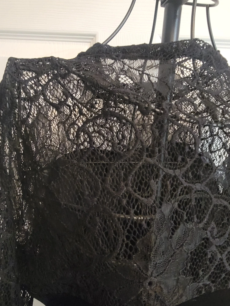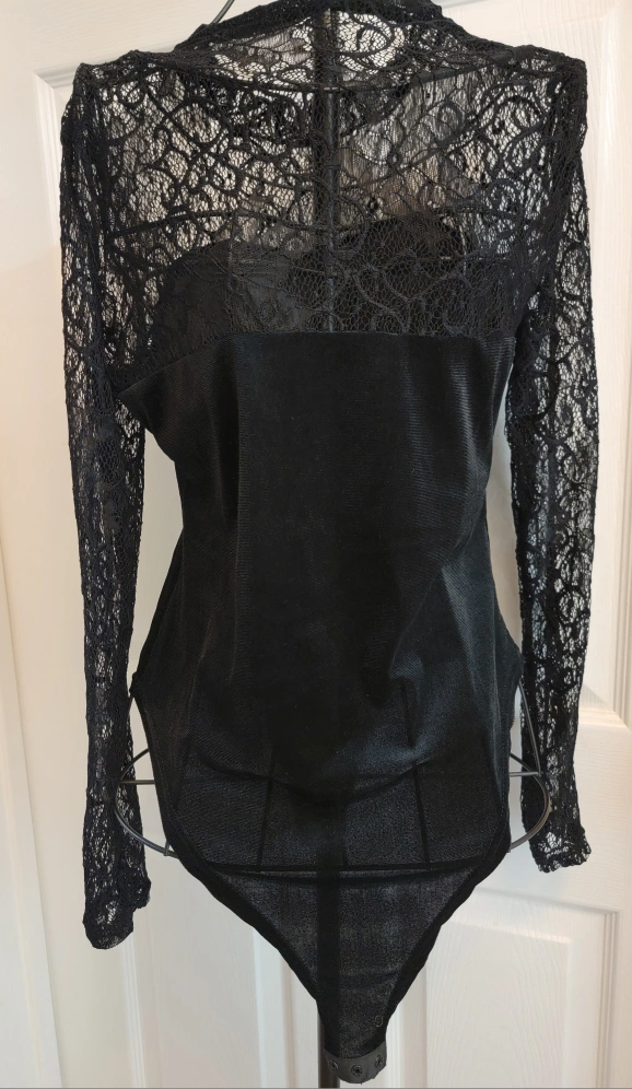 Long-sleeved black bodysuit with a lace overlay. The bodysuit is a stretchy material. The lace is delicate.