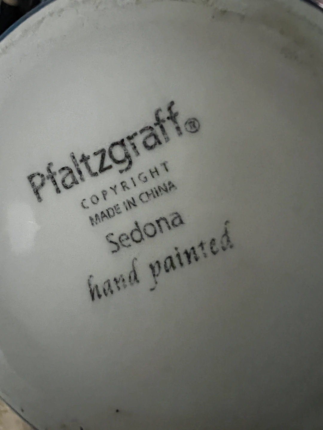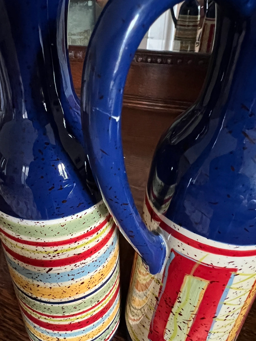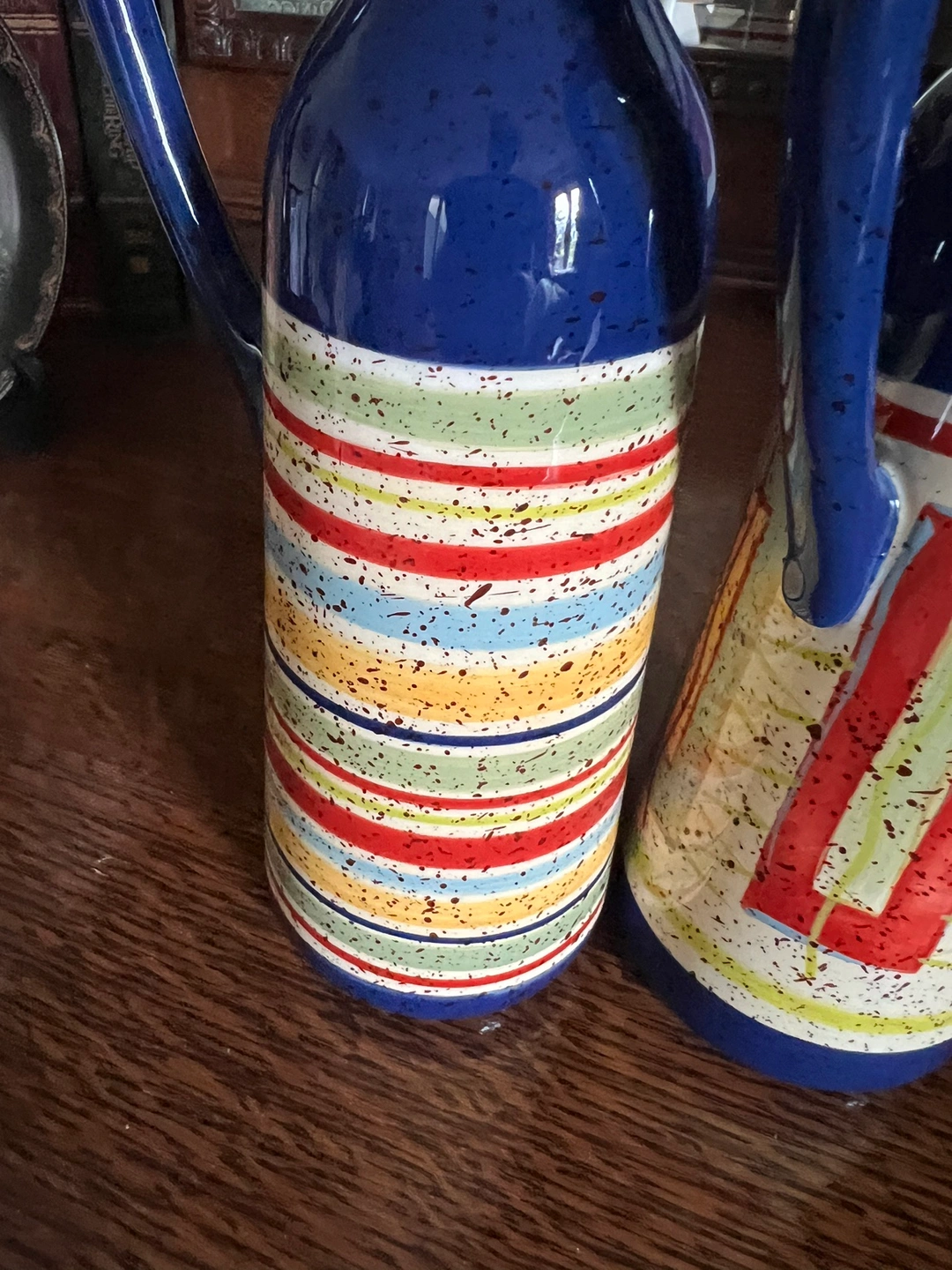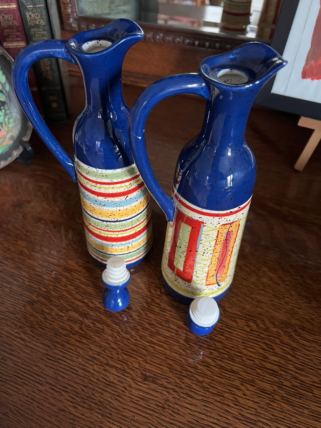 Set of two hand-painted olive oil bottles with stoppers. One has a crack in the handle - barely noticeable - but to be used and safe I’d definitely investigate repair. They are beautiful pieces for the affectionado and collector