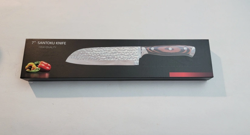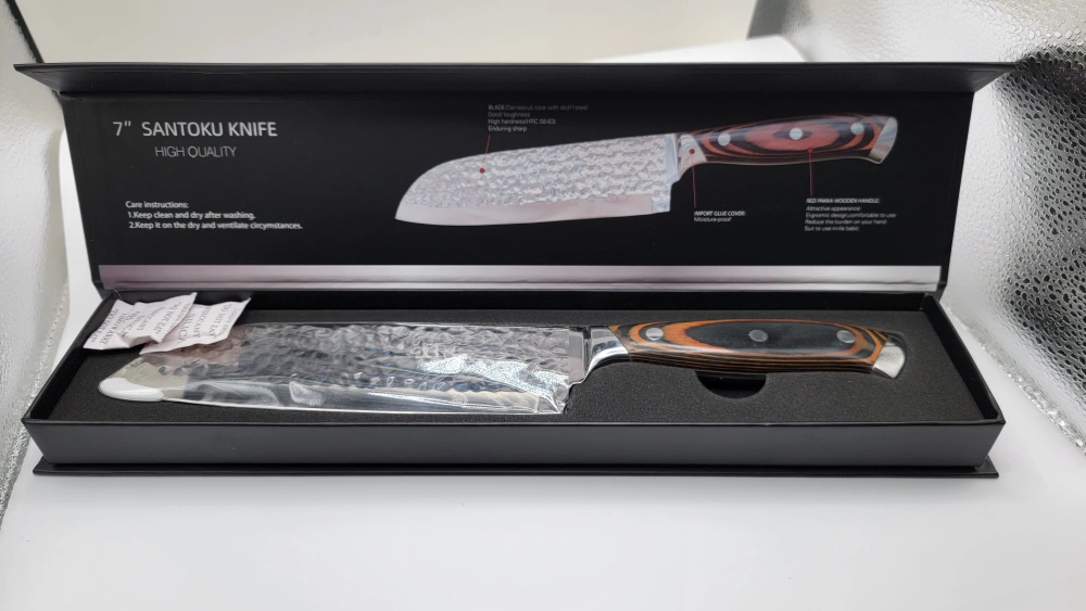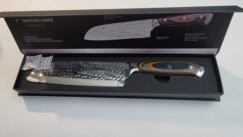 Razor Sharp 8-12° degree angle per blade side makes this kitchen Santoku knife extremely sharp. The extraordinarily super sharp blade was painstakingly honed by most experienced craftsmen. °•○•°•○•°•○•°°•○•°•○•°•○•°•○ Retails $70+ 🌟 New | Price: $30 ✨ Makes a great gift 🎁 📍 Convenient Pick Up Location: Scarborough Golf Club Road & Lawrence Ave East 🚚 Local Delivery Available or Shipping via UPS/Canada Post at low rate charge* 🔍 Explore my other listings for more fantastic offers! Thank you for your interest! °•○•°•○•°•○•°°•○•°•○•°•○•°•○•° This Santoku knife is a multipurpose knife for professional kitchen applications, great for mincing, slicing and dicing fruit, meat, fish and vegetables. Super sharp edge will help lock the foods original flavours and nutrition AUS-11 premium DAMASCUS (SKD-11) steel as the core of the blade, incorporated with another 66 layers of premium high carbon stainless steel, all of these ensures this sharp Santoku Knife with a high level of rust-resistance, wear-resistance and long-lasting performance. Hardness of the core blade reaches to HRC 58-63 ERGONOMIC RED PAKKA WOOD HANDLE, the handle of this multipurpose knife is made for life-long durability, free from heat, cold and moisture effects. Triple rivets on the full tang increases the extra strength and durability. An ergonomically designed handle ensures a secure and comfortable grip GREAT BALANCE, GIFT BOX PACKED, finely balanced from the tip to the heel, complete with a full tang for the ultimate support and leverage. This helps provide you great comfort, remarkable control and unbelievable smooth cutting experience. This all purpose Santoku knife is nicely packed with a beautiful GIFT BOX.