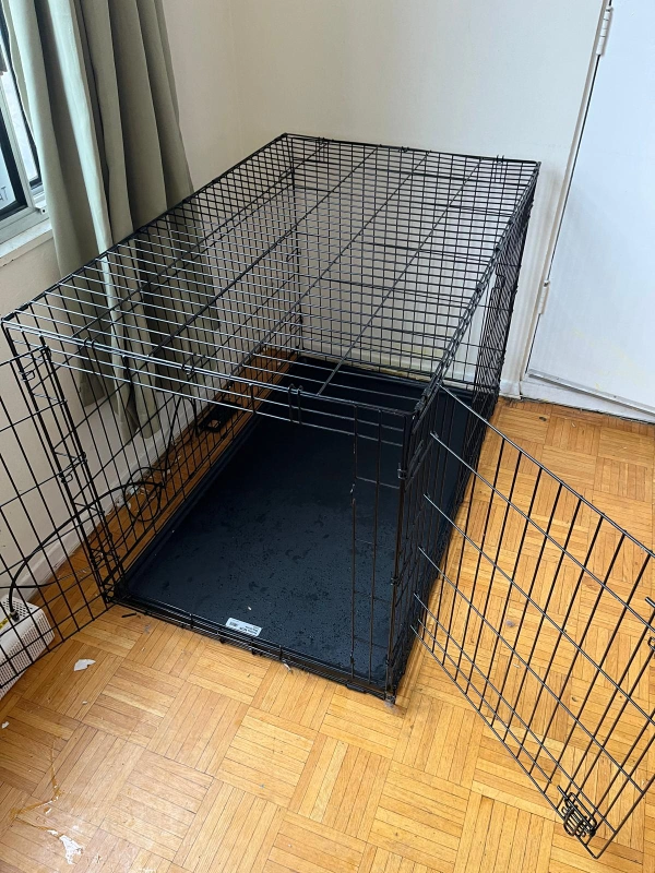 A XXL black metal dog crate with a removable plastic tray. The crate has two doors that open. The crate is in good condition. it's collapsible and easily moved or stored DOG CRATE MEASUREMENTS 48" x30"x 33" $100 or best offer ! Available for pickup AT 140 carlton Cash only ! thanks , Yulia.