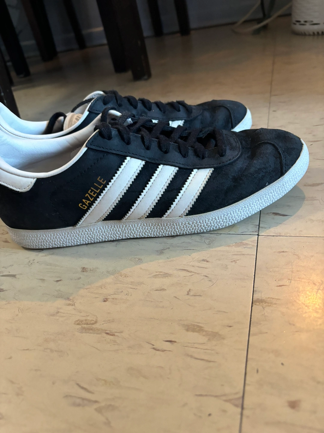 Black Adidas Gazelle shoes with white stripes. They are size 8.