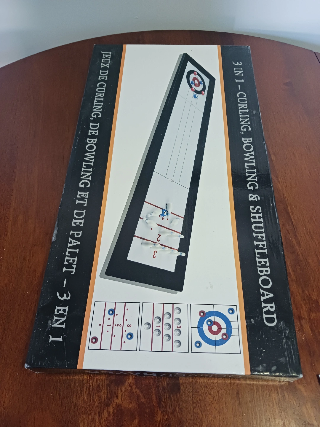 Selling a 3 in 1 game set that includes curling, bowling, and shuffleboard! It's a great way to have some fun indoors with friends and family. The box has some wear, but it's never been opened.
