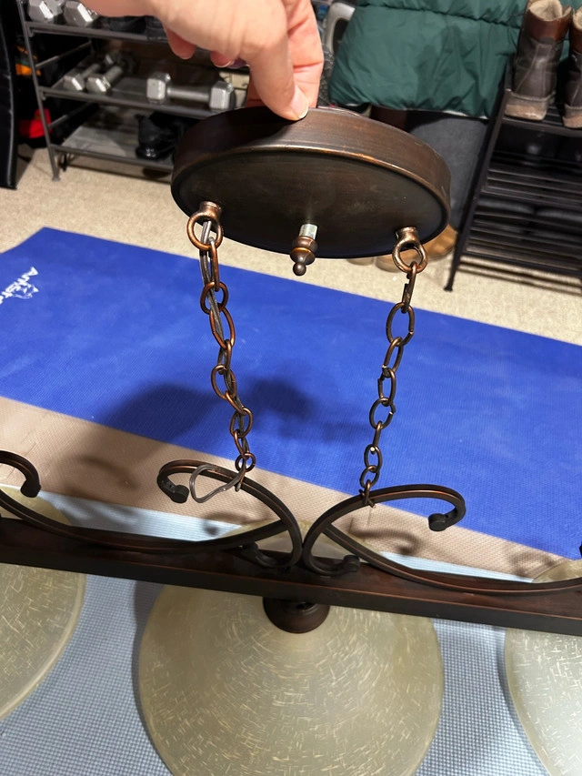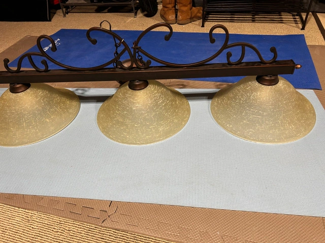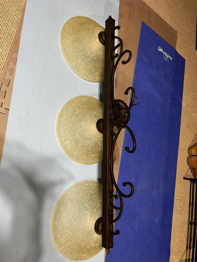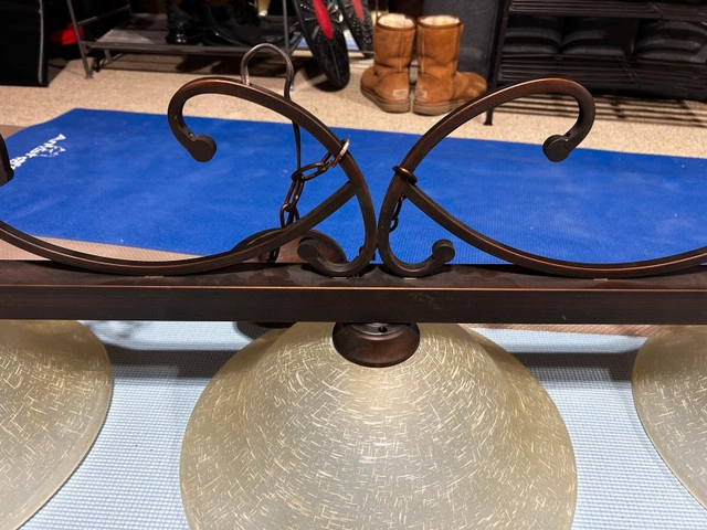 Illuminate your space with this elegant used three-light bronze ceiling fixture, featuring frosted shades that add a touch of sophistication to any room. This fixture provides a warm and inviting ambiance, perfect for dining rooms, living rooms, or entryways. * **Type:** Ceiling Light * **Number of Lights:** 3 * **Finish:** Bronze * **Shade:** Frosted Glass If the ad is up, the light is available!