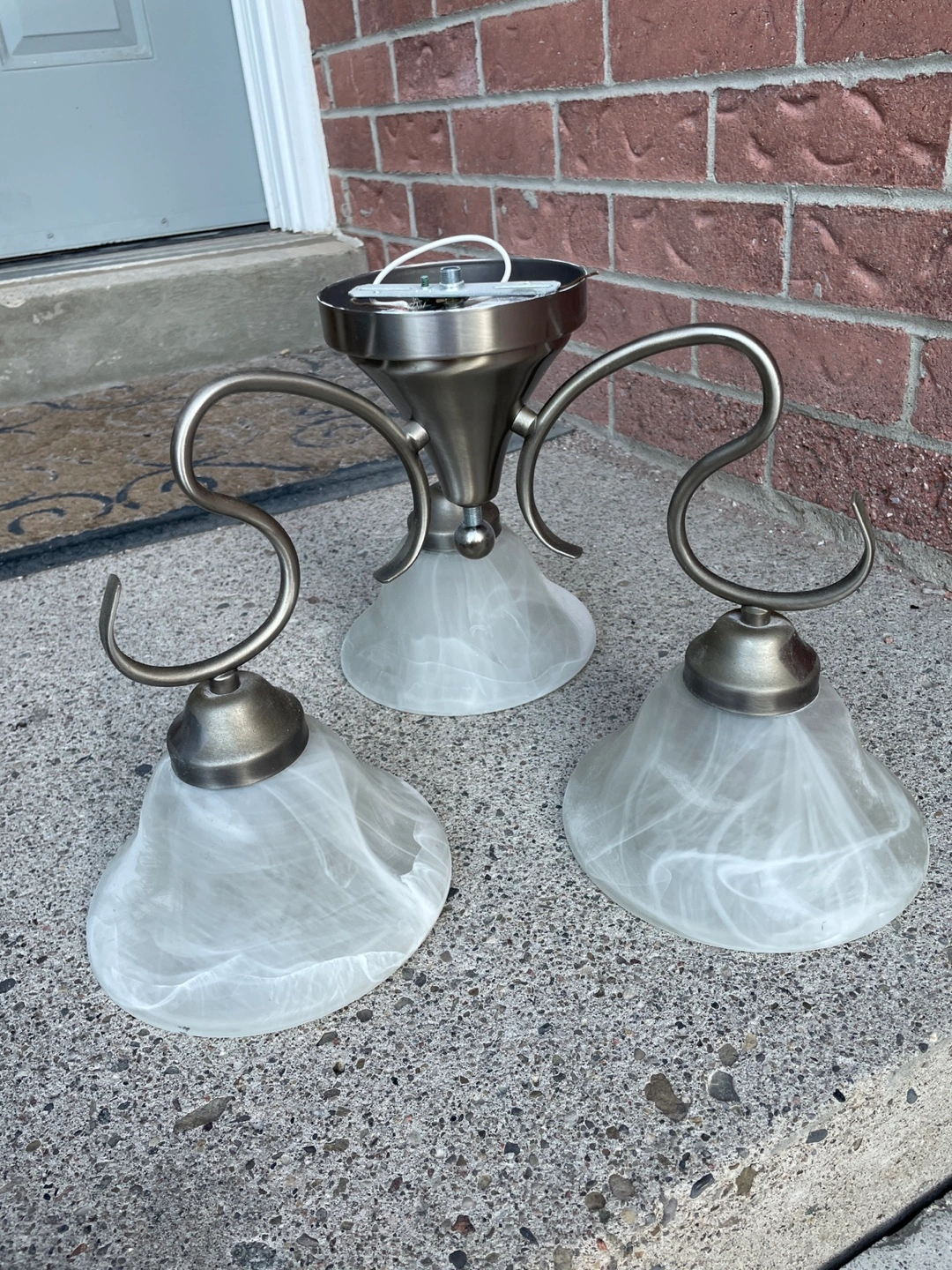 Selling a 3-light chandelier with a brushed nickel finish. It features a classic design with swirling arms and bell-shaped shades. Perfect for adding a touch of elegance to any room in your home! Porch pick up Yonge and 16th