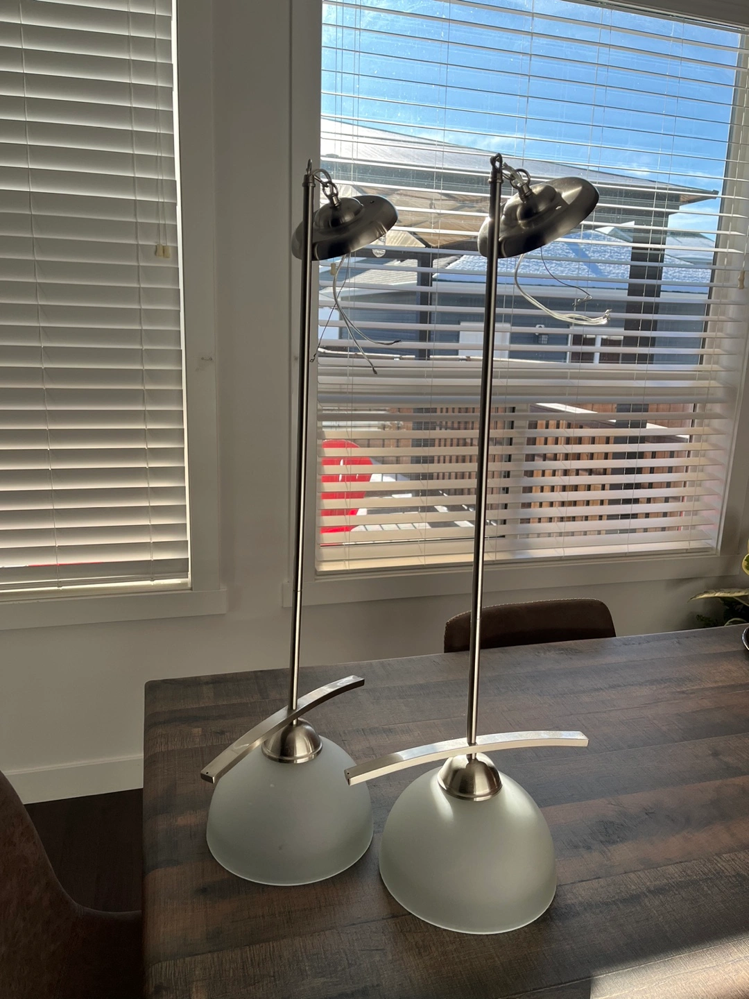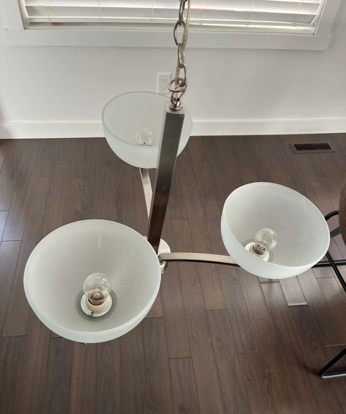 Chandelier with three frosted glass shades. Comes with chain for hanging and a ceiling plate. $120 for all.