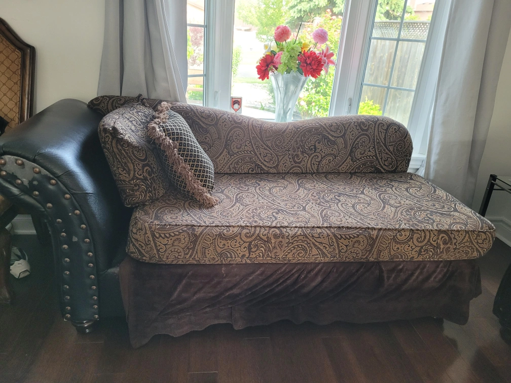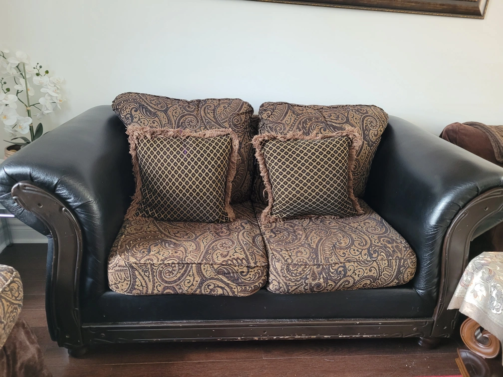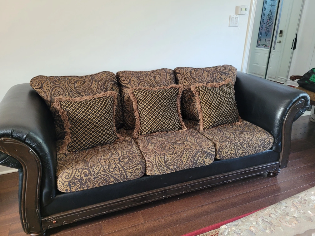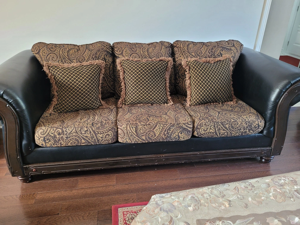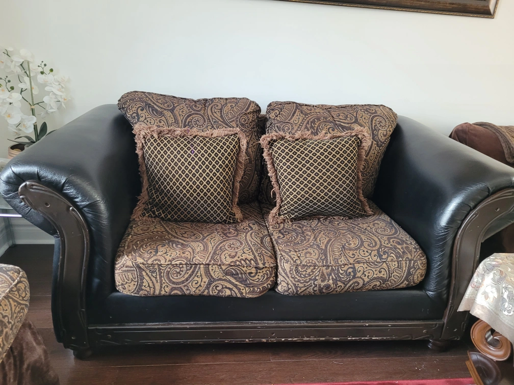 Selling a stylish and comfortable 3-piece sofa set that includes: 1 three-seater sofa 1 two-seater loveseat 1 chaise lounge Features: Elegant paisley fabric cushions with matching throw pillows Black faux leather armrests with classic wood accents Cushions are still firm and supportive Solid frame – built to last Perfect for a living room, rental unit, or basement lounge Condition: These sofas are used and show signs of wear. The faux leather is peeling in some areas (see close-up photos), but the structure and seating are still in very good condition. Dimensions (approx): Three-seater: W 84” x D 36” x H 34” Loveseat: W 63” x D 36” x H 34” Chaise: W 72” x D 35” x H 34” Price: $400(Negotiable) From a smoke-free and pet-free home Great value for anyone looking for solid, spacious seating at a budget price. Message if interested!