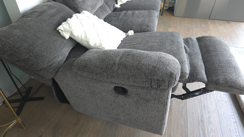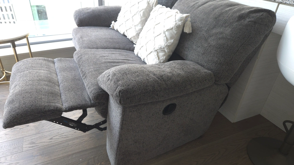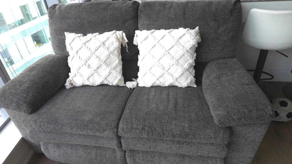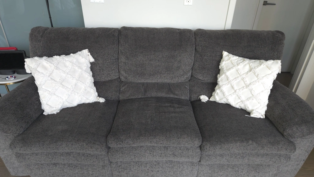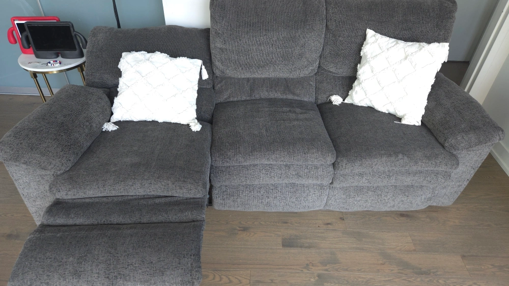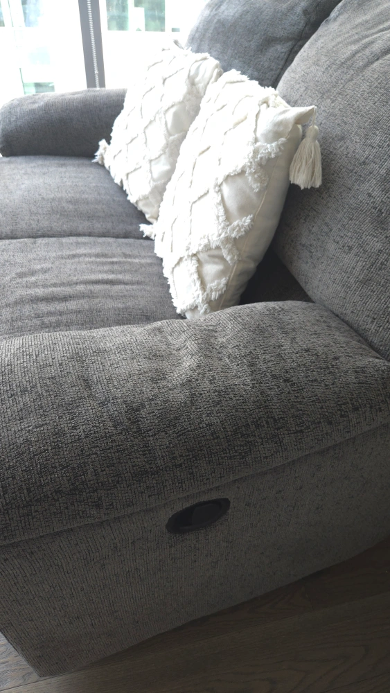 Selling a Palliser reclining sofa! It's in great shape and super comfy. The sofa is upholstered in a stylish grey fabric that will fit right in with any decor. Perfect for relaxing after a long day!