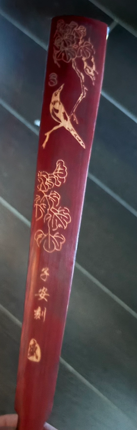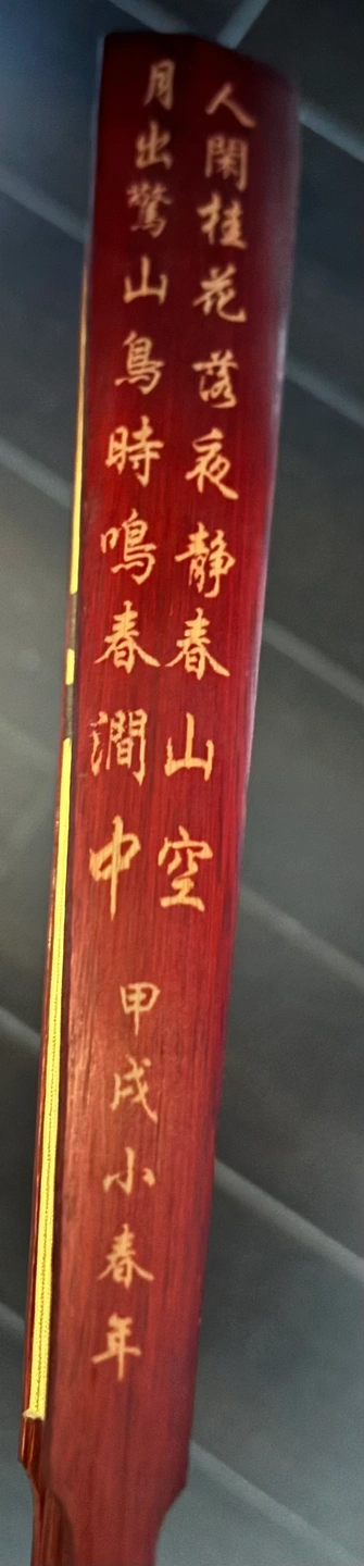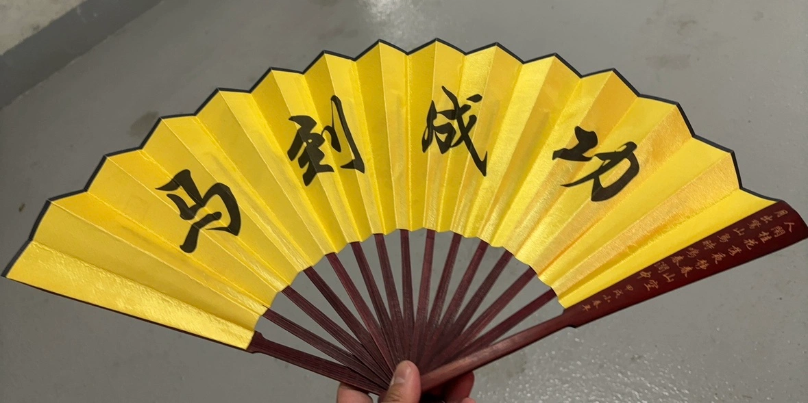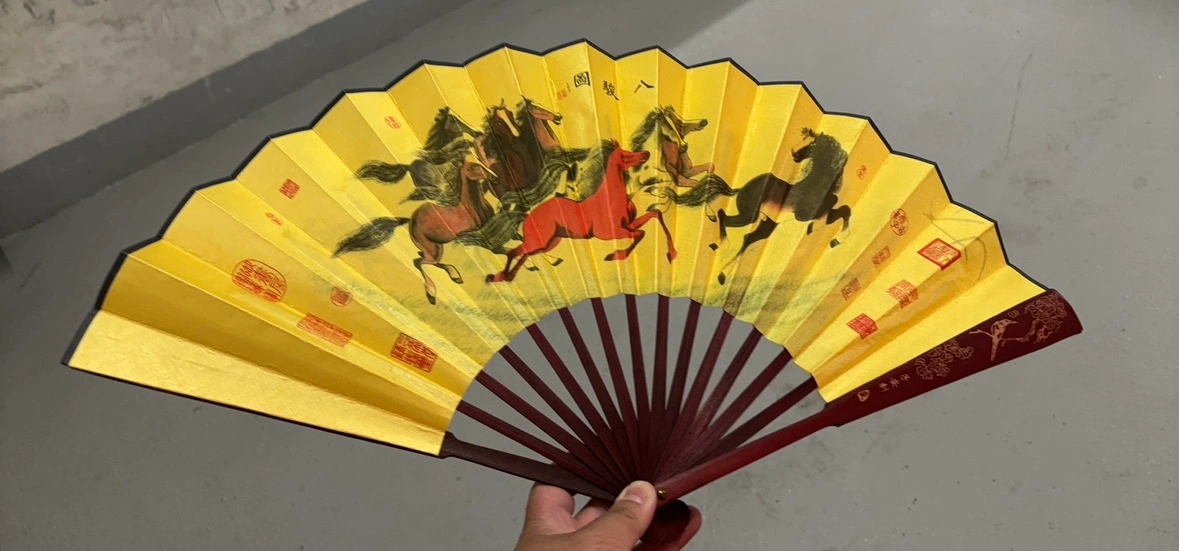 A beautiful Chinese hand fan with a gold fabric and a dark red wooden frame. The fan has Chinese calligraphy on one side and a painting of horses on the other. The fan is in good condition with no visible wear or tear. It would make a lovely addition to any collection or be a great gift for someone who loves Chinese culture. Pick it up near Richmond Centre