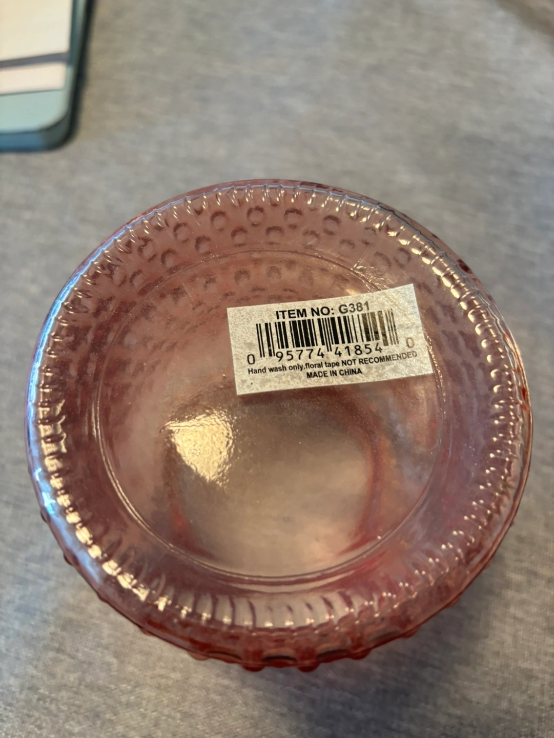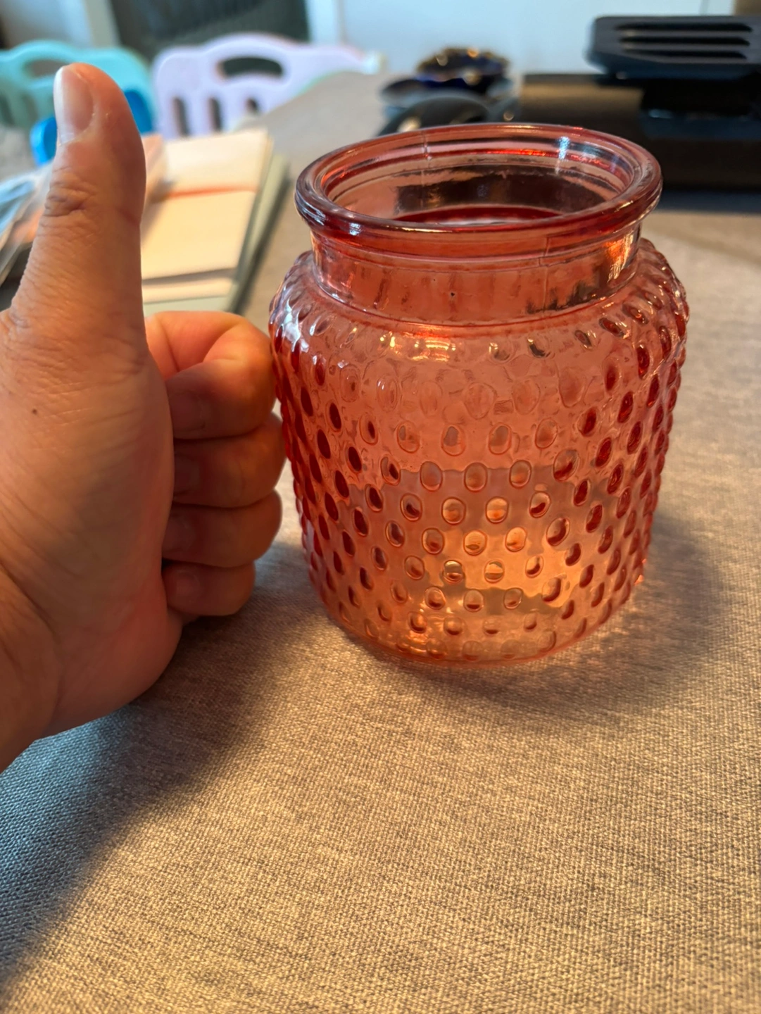 A pink glass jar with a textured surface and a wide mouth. Pick it up near Richmond Centre