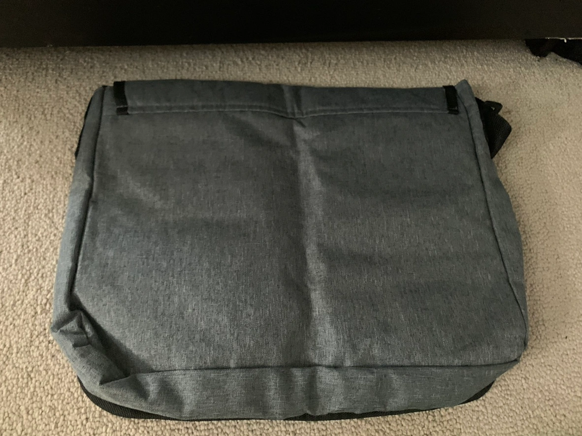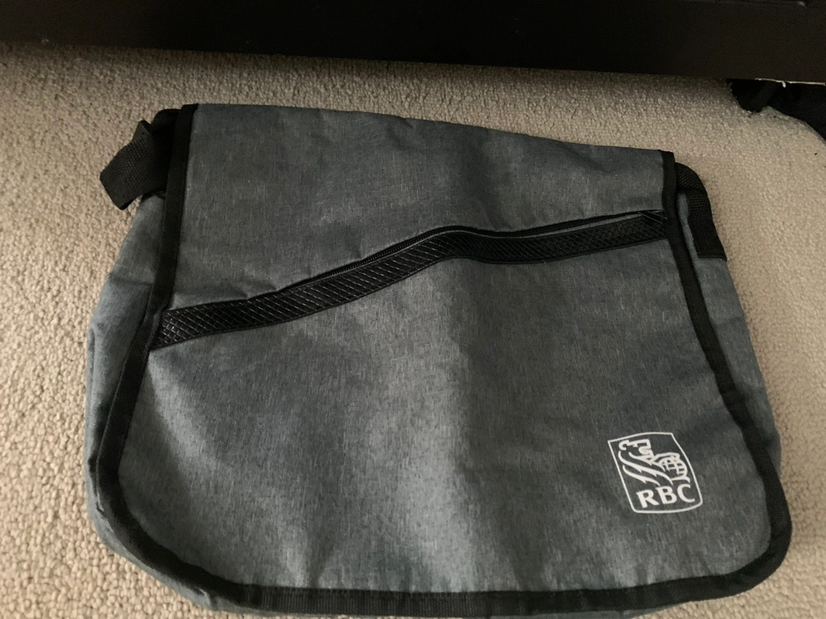 Grey messenger bag with black accents. Features an adjustable shoulder strap. The item is brand new and pick it up near Richmond Centre