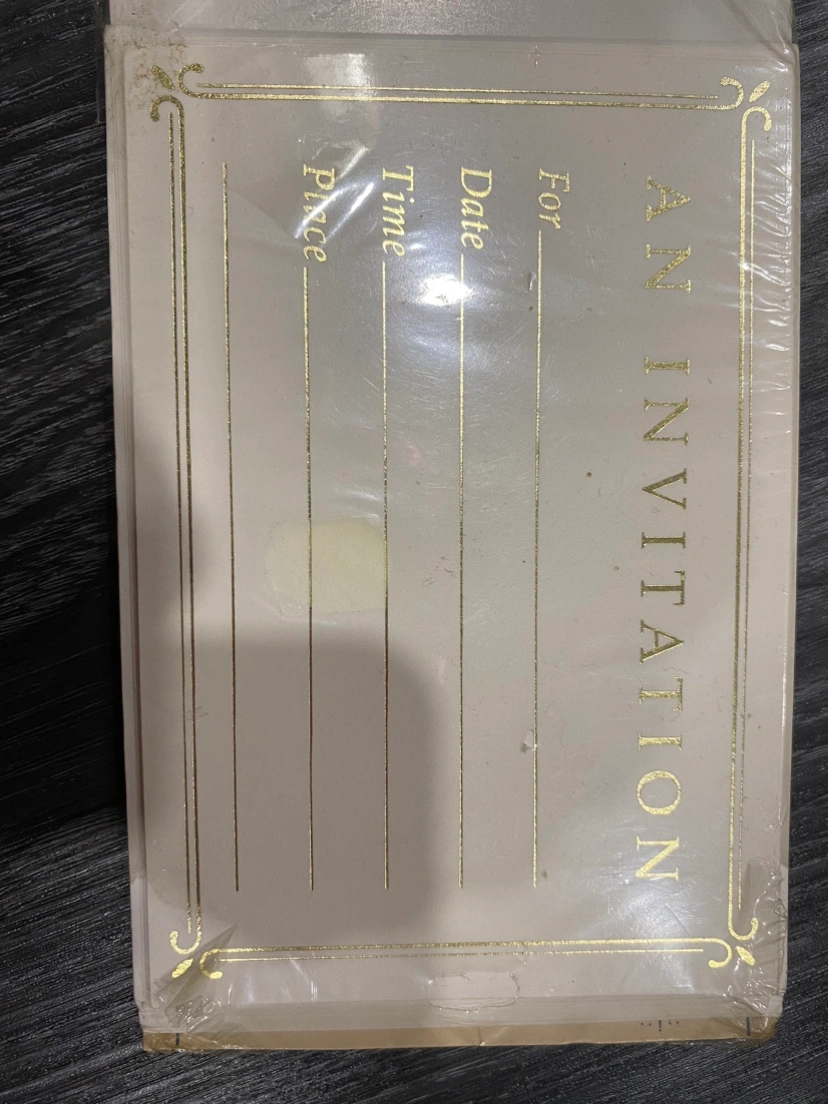 A package of blank invitations from Hallmark. The invitations are white with gold lettering. The invitations measure approximately 4" x 6.5"