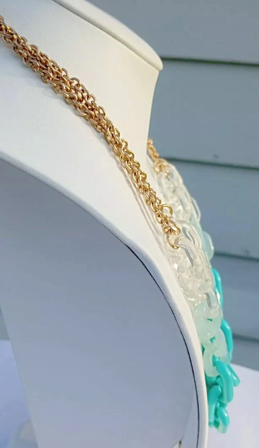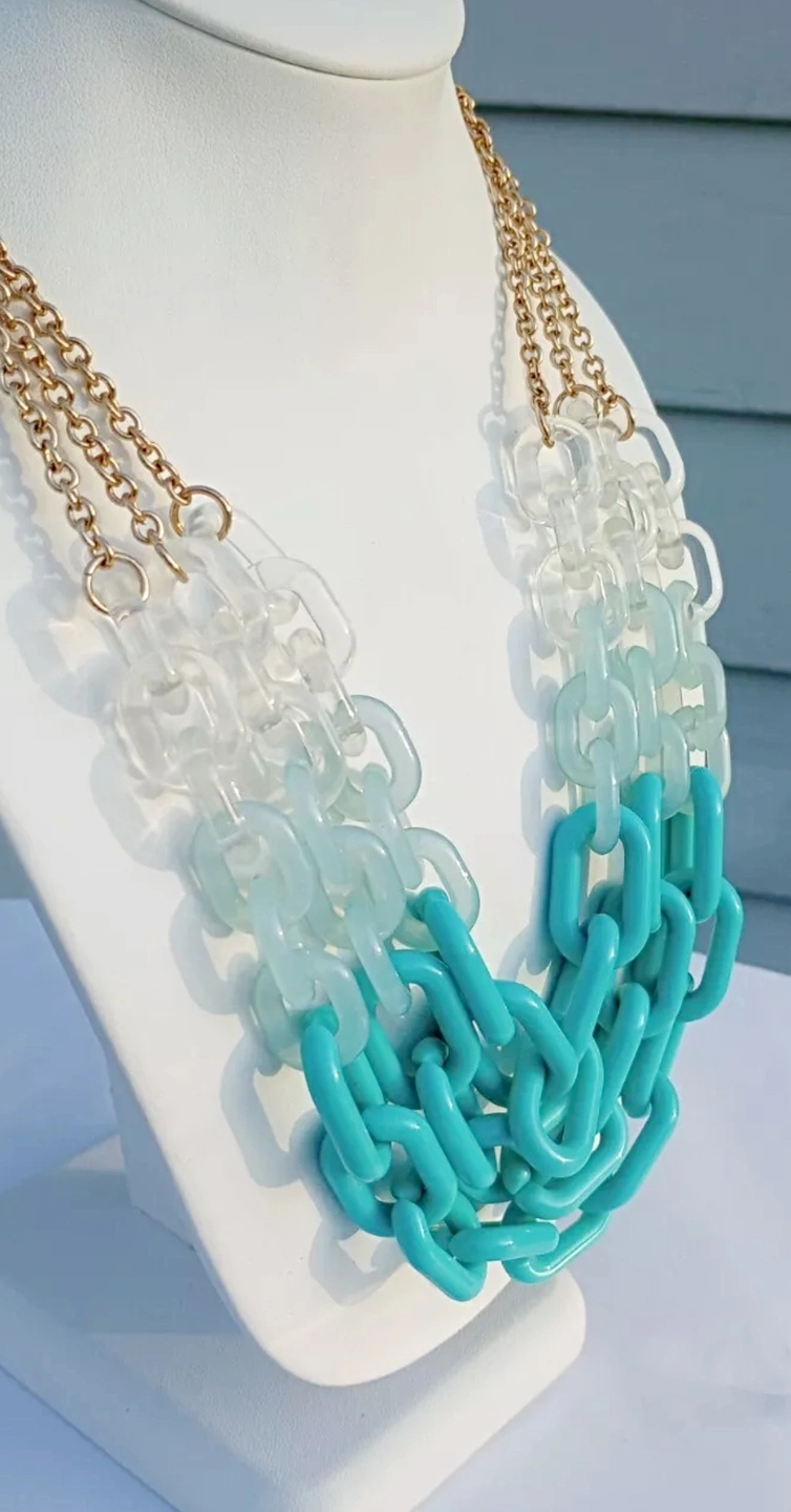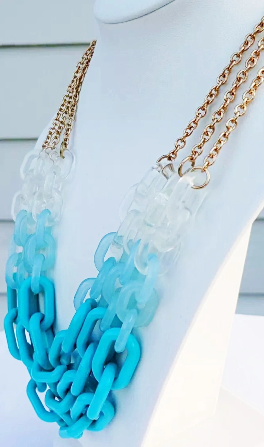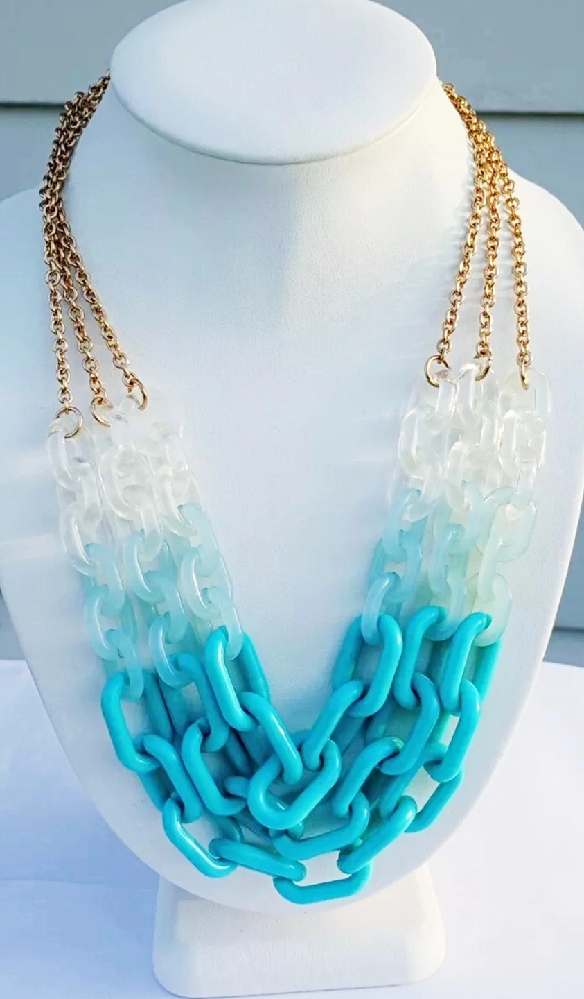 This is a beautiful statement necklace with a gradient of white to blue acrylic links. The necklace also has a layer of gold chains. It would be perfect for adding a pop of colour to any outfit. Excellent Condition