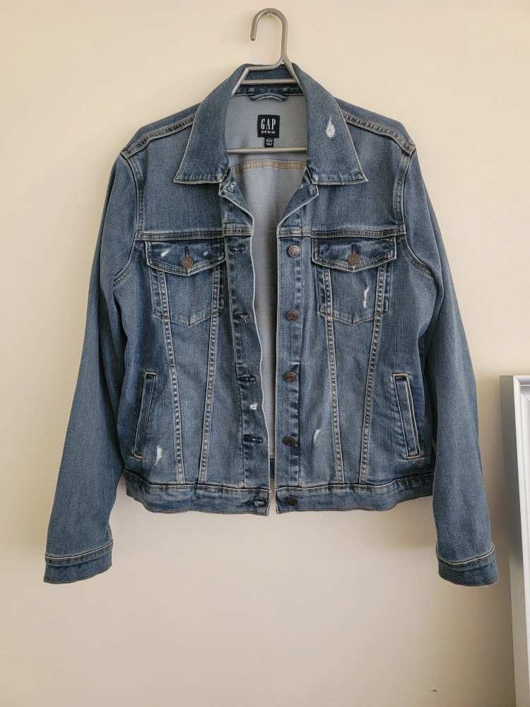 A women's size Large Gap Denim Jacket. It features a classic fit, long sleeves, and a button-up closure. The jacket is made of a soft and comfortable denim material and has a faded blue colour. It also has a few distressed areas. It is perfect for any casual outfit. Like new condition. worn maybe two to three times.