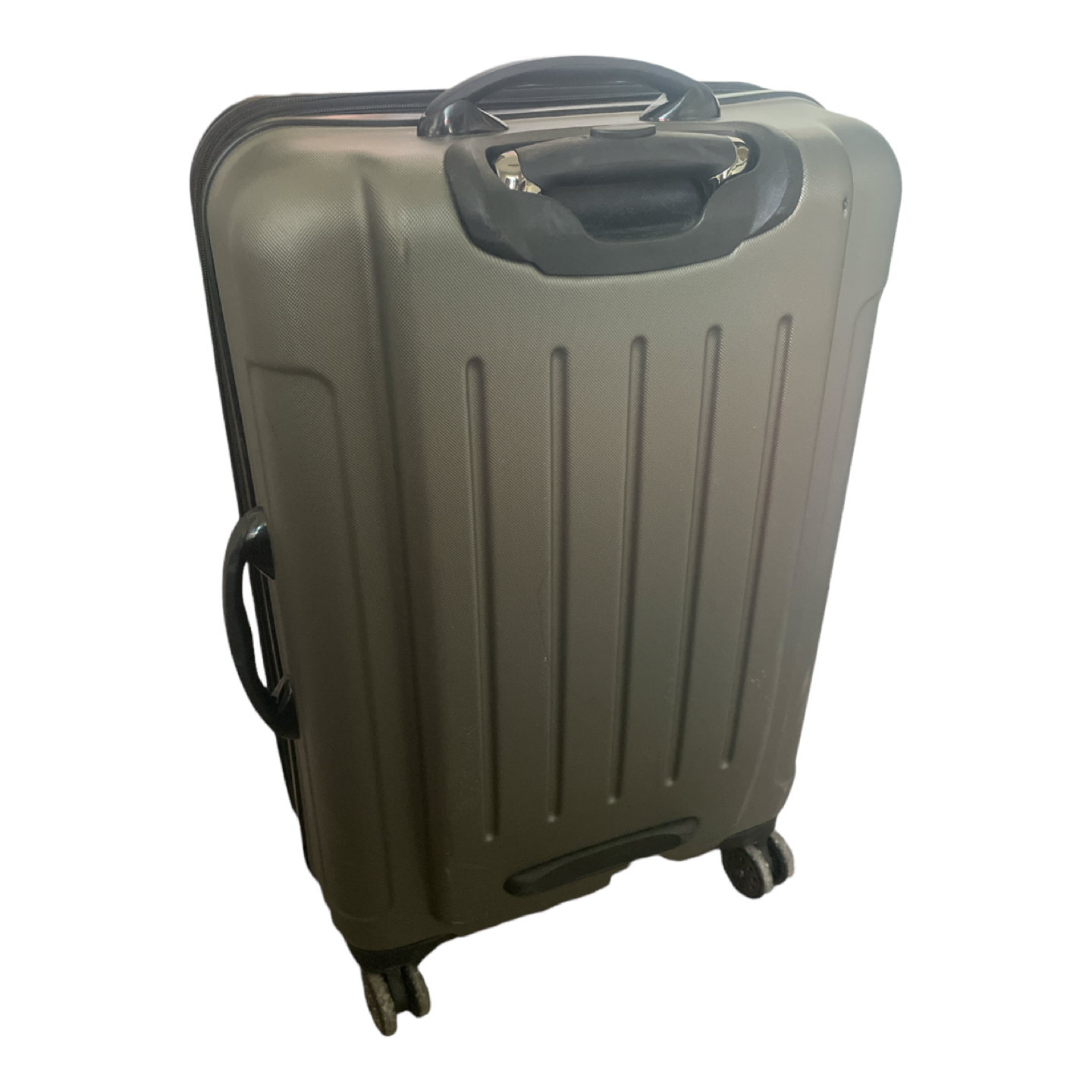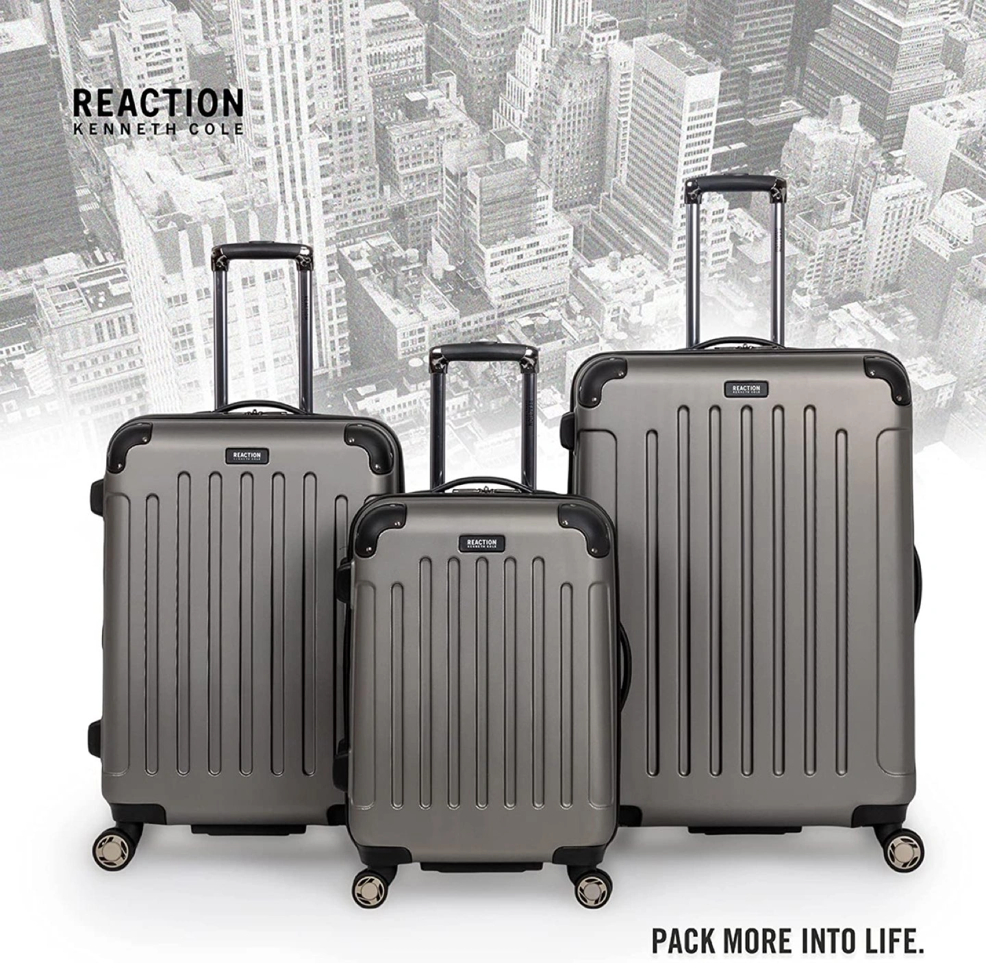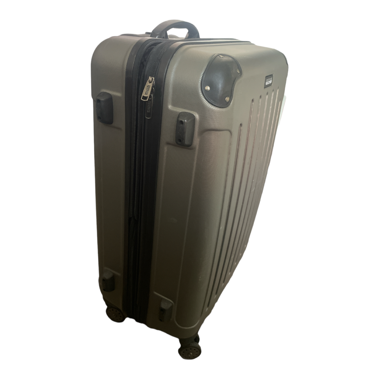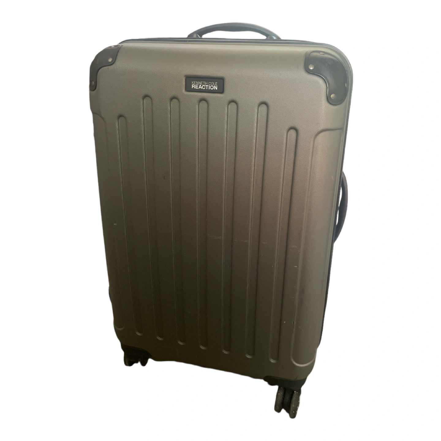 Kenneth Cole Reaction Grey Hardshell 28" Checked Luggage Suitcase Gently used condition - a few small scratches and bumps Lightweight, durable, flexible, shock-resistant, textured ABS shell. Adjustable clothing compression panel, multiple mesh zipper pockets, two elastic pockets fro additional storage, multi-directional 8-wheel spinners, sturdy locking retractable push button telescopic trolley handle, molded corner guards, expandable. Dimensions includes wheels: 30" H x 22.5" L x 13"-15" d. Weight 11.0 lbs. More measurements available upon request.