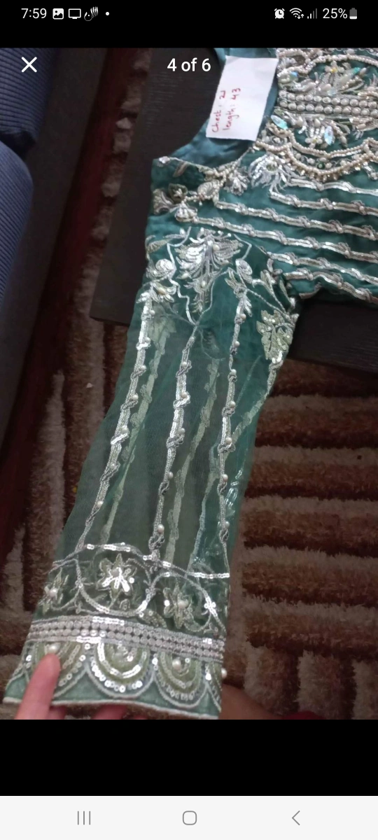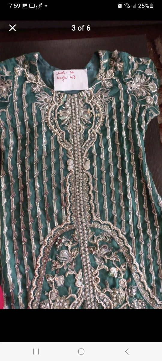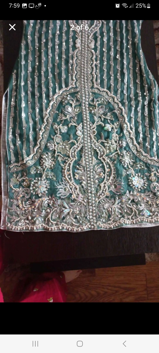 A beautiful green embroidered shalwar kameez with a matching dupatta. The kameez is made of a soft, flowy fabric and features intricate pearl and sequins embroidery throughout. The shalwar is plain green and comfortable. The dupatta is also green with small silver dots. The kameez is perfect for any special occasion.