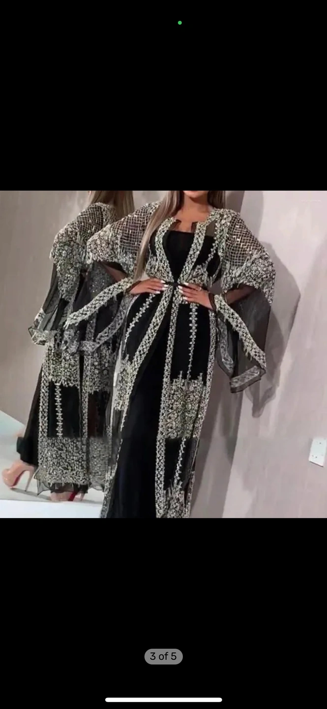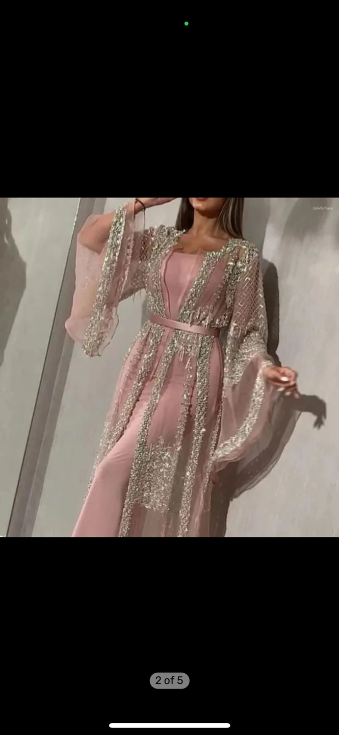 This is a beautiful dress that features a sheer fabric with beading throughout. The dress has long sleeves and a flowing skirt. It would be perfect for a special occasion.