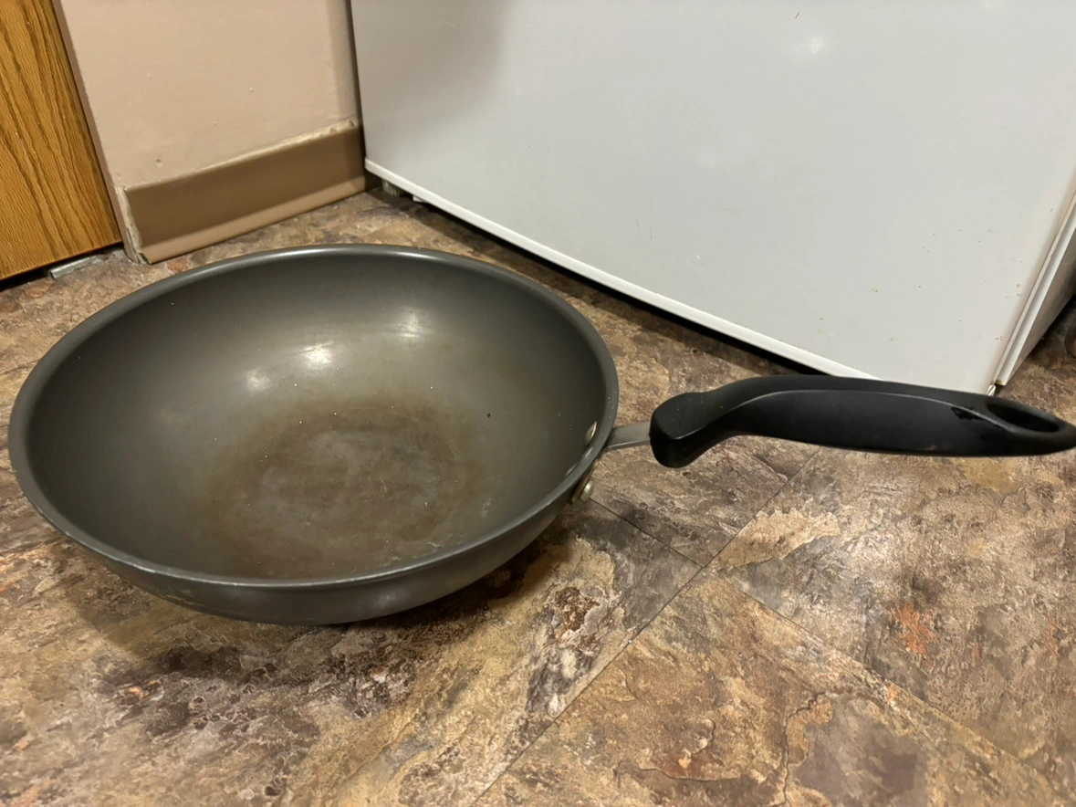 This is a 12 inch wok with a black handle. It is made of a hard-anodized aluminum. It has a ridged bottom. It is in good condition. The wok is 29 cm in diameter Pick it up near Richmond Centre