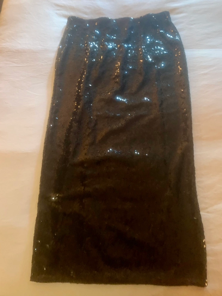 Still has the tag. Never wore this. Bought a coupe of years back. I am 5’7” and the length on me is to the ankles. Side zipper and slit in the front of the skirt. Gorgeous skirt !