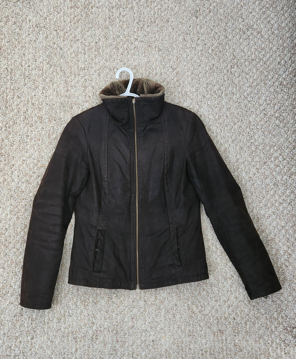 A brown leather jacket with a faux fur collar. It has a zipper closure and two button pockets. The jacket is in good condition. $70 or Best Offer cash and pick up only