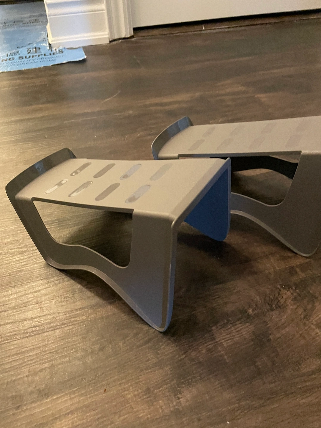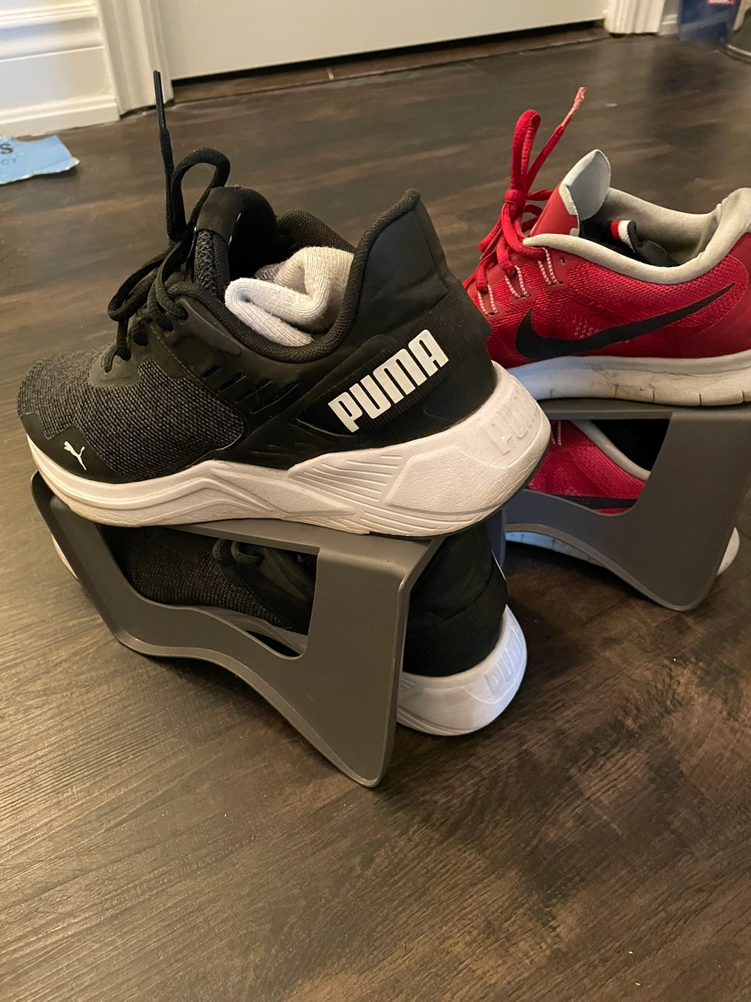 Three grey shoe organizers. Each can hold a pair of shoes. Saves space.