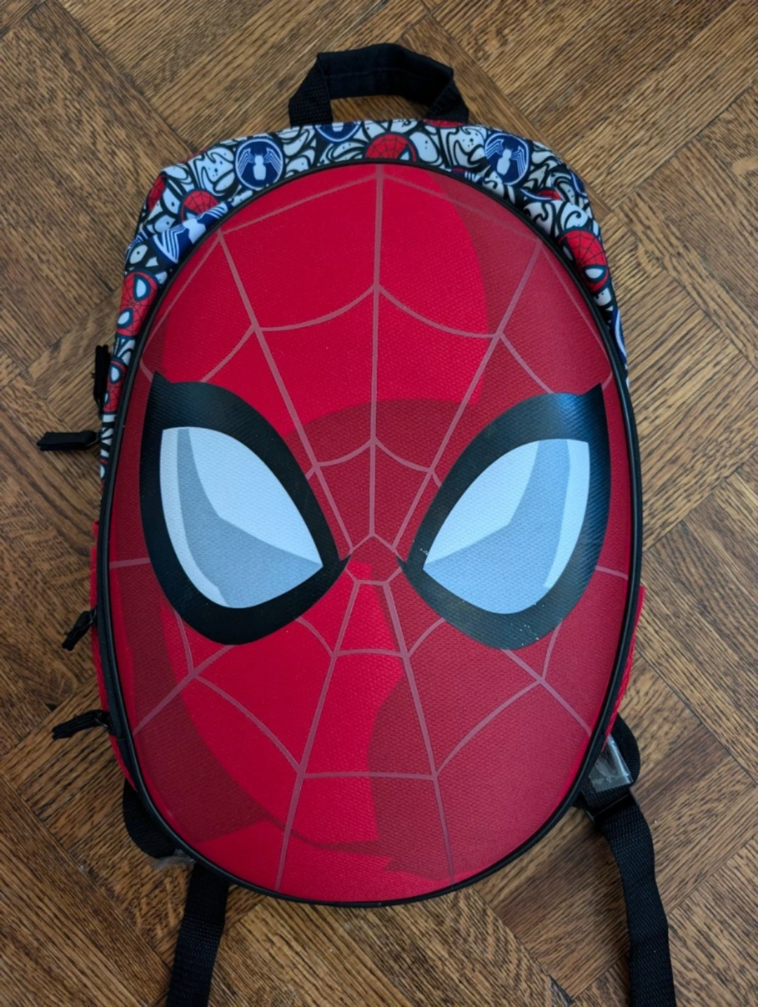 A black backpack with red accents and Spiderman design on the front. Brand new my son hot it for his birthday but he don't like spiderman anymore