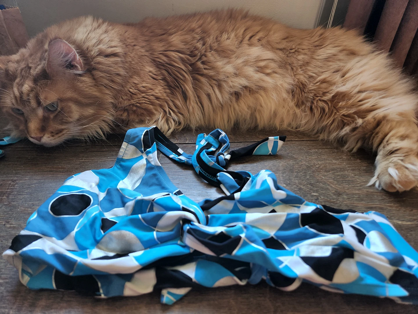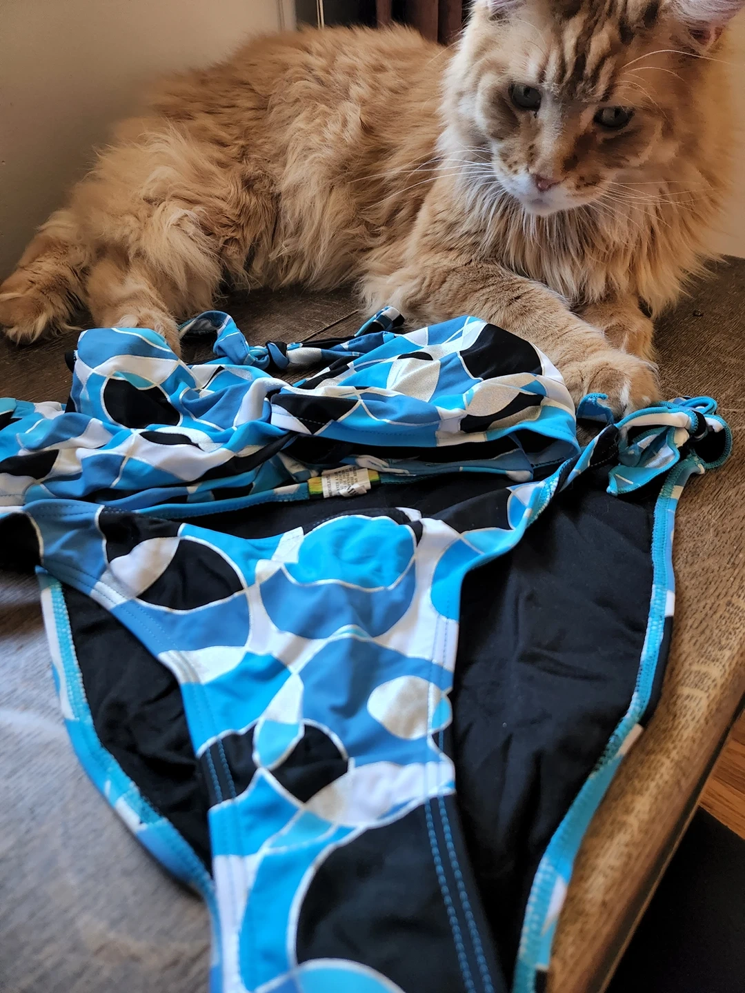 From Bikini Bay Top size 38 & bottom 18 - consider both a large. Wore this in a hotel hot tub so bottom elastic is very poor but top is okay. Porch pickup only in the Yonge and Sheppard area cat model not included