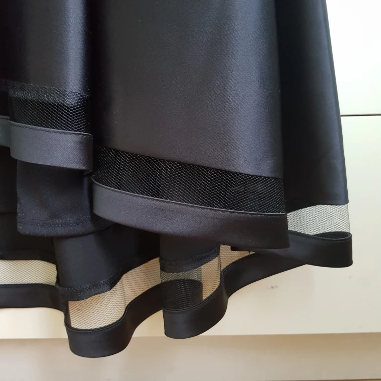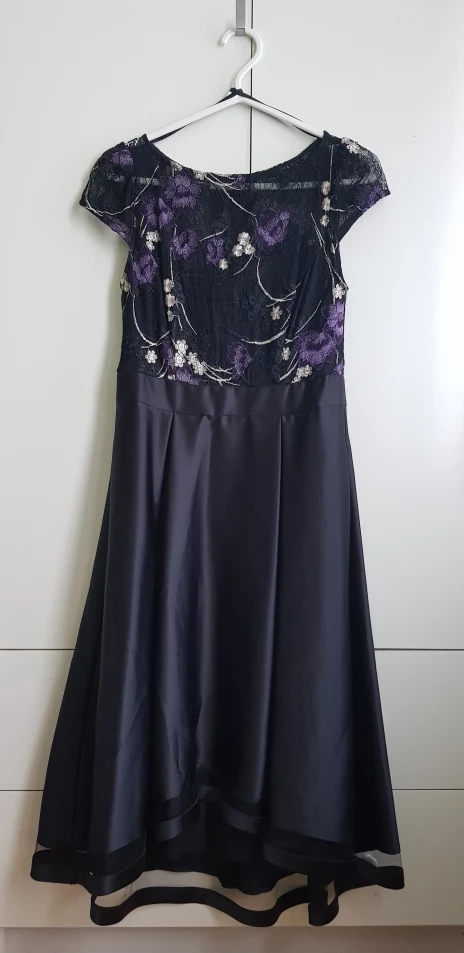 Beautiful black dress with lace bodice, purple floral embroidery, and a satin skirt. It has a back zipper and a modest neckline. The skirt has a slight A-line shape and asymmetrical in the back. Perfect for a special occasion, like prom or wedding. Pets free, smoke free home Pickup near or at Cornell Public Library, or Delivery to Markham, Pickering, or Stouffville