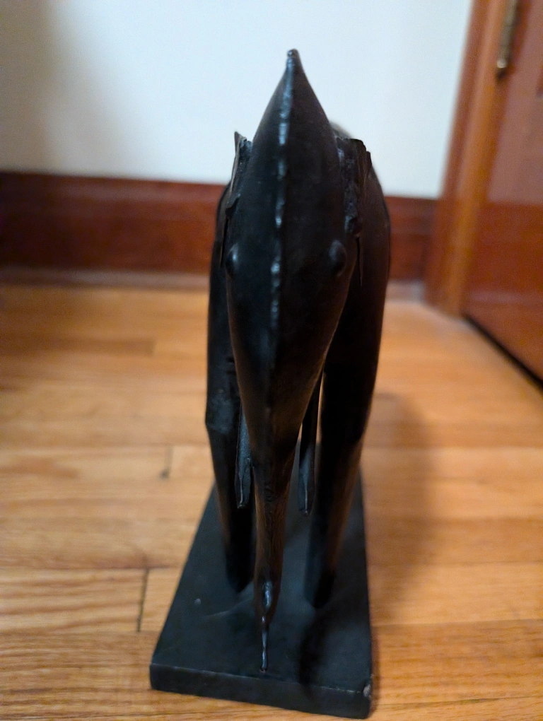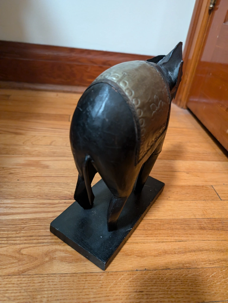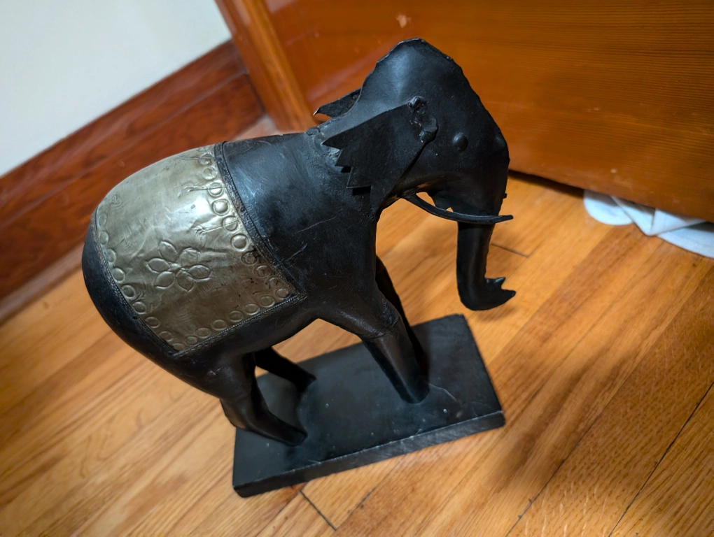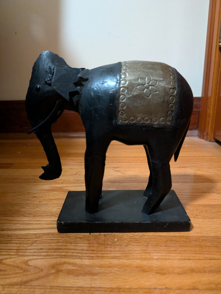 A black metal elephant statue with a decorative silver plate on its back. It is sitting on a black wooden base.
