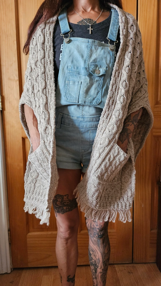 Cream coloured shawl with cable knit design and fringe. There are two pockets on the front. The shawl is made from 100% merino wool. Great for staying warm on chilly days! And very attractive. Available for pick-up near Oakwood Village. MAKE OFFER.