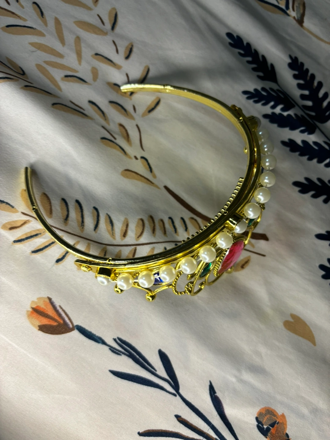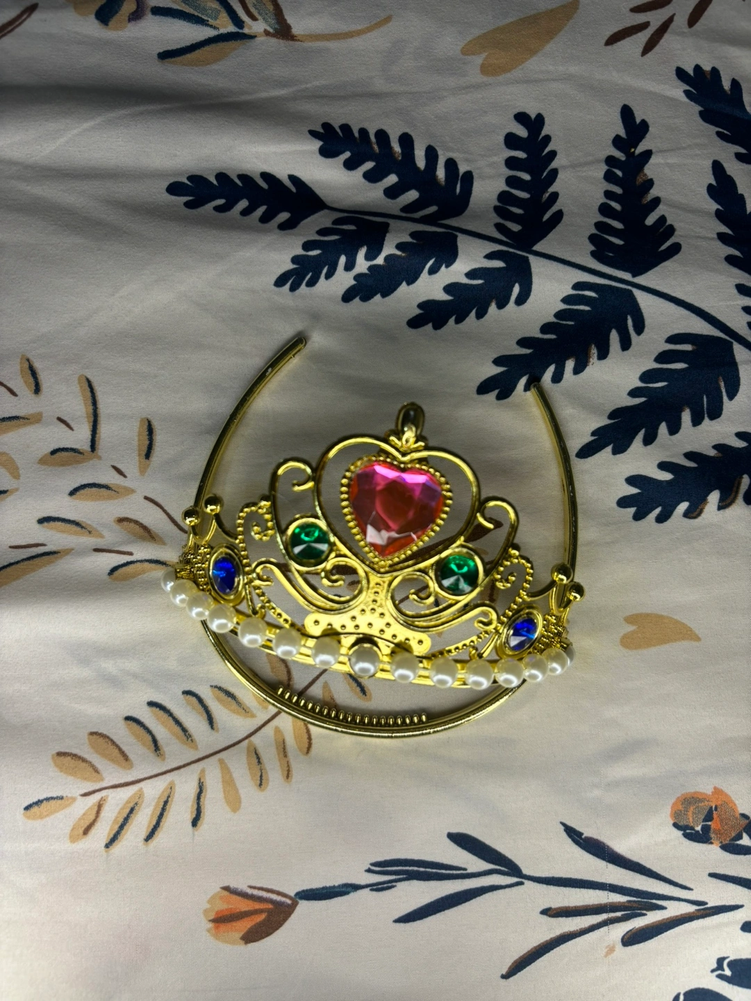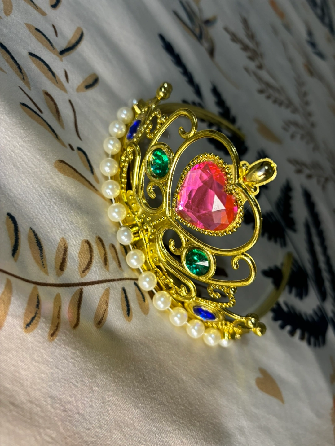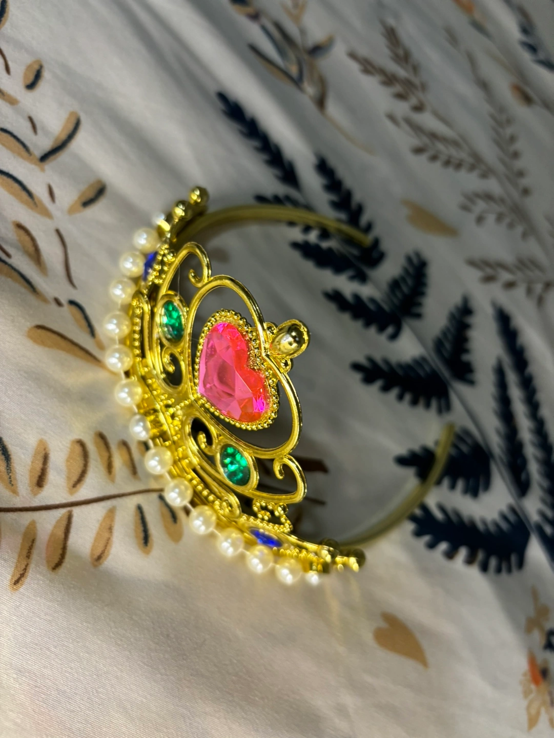 Gold tiara with a pink heart-shaped jewel, green gems, and white pearls. Brand new Any age It is free size. 💯