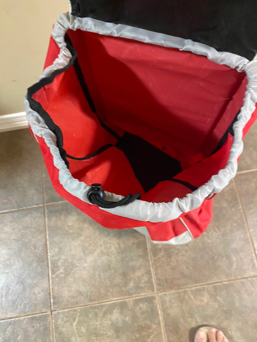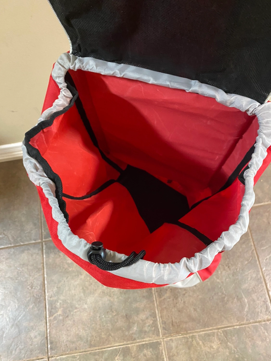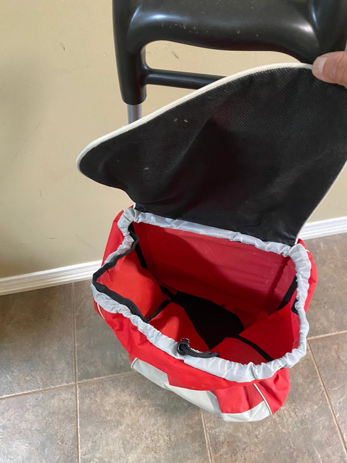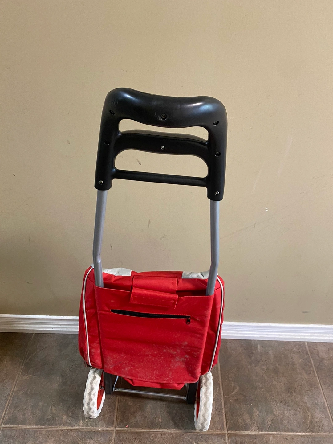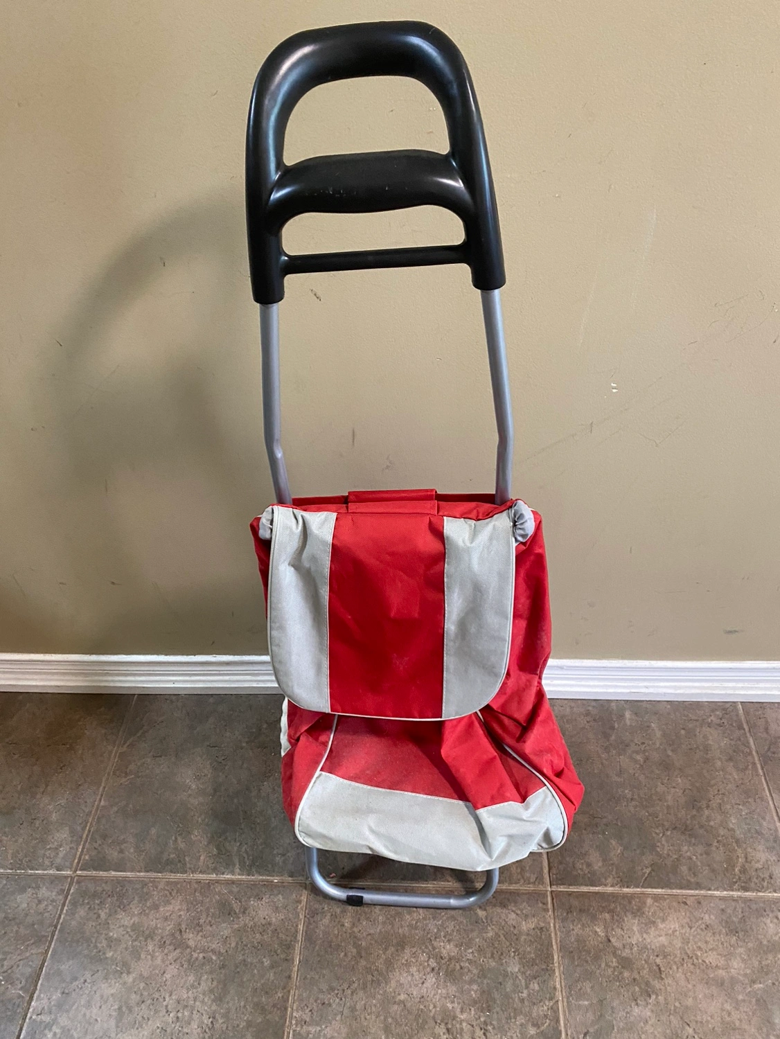 This is a red and grey foldable shopping cart with wheels and a handle. It folds for easy storage. The cart is in good condition and ready for your next shopping trip! - it is sturdy and comfortable - handle is thick so strong in material