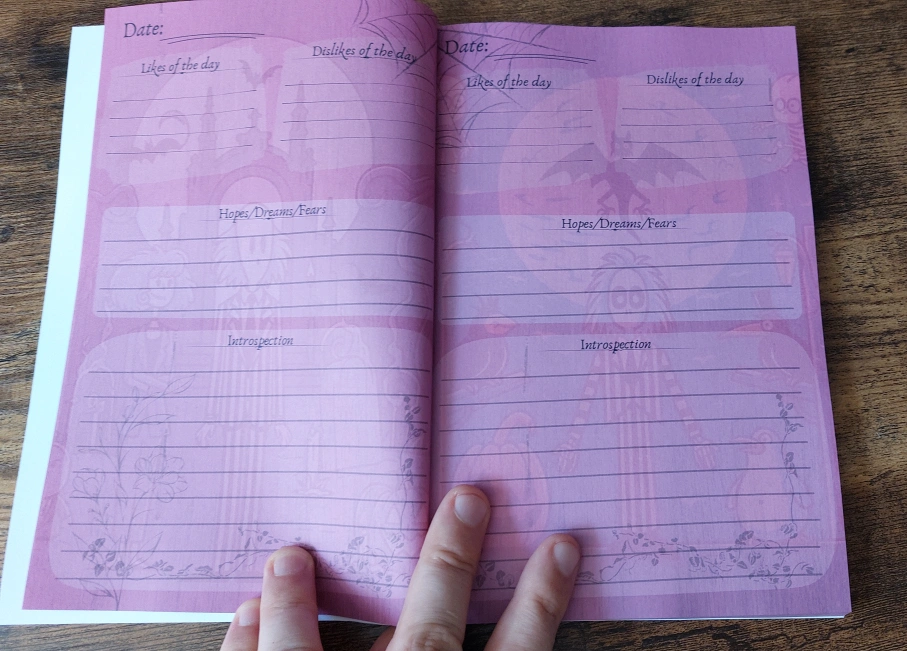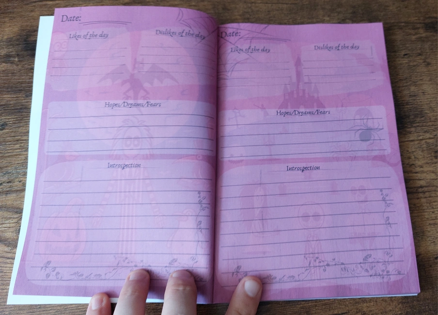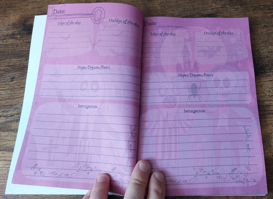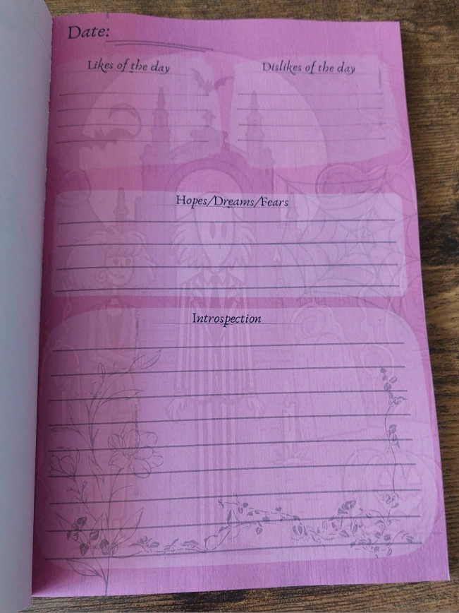 This is a Beetlejuice inspired journal. It is blank inside and features spaces for you to write about likes, dislikes, hopes, dreams, fears, and introspection. It has 150 pages https://www.amazon.ca/dp/B0D6L3XM8D/?coliid=I331GCHOXSP59L&colid=1DLNAFFQ64HLR&psc=1&ref_=_sed_dp