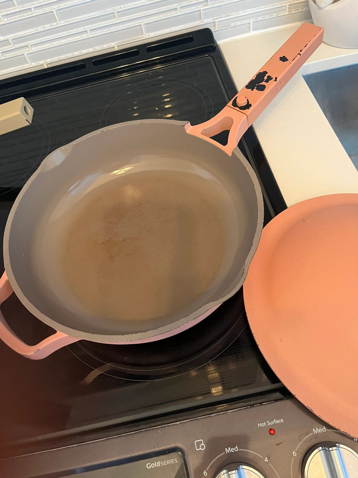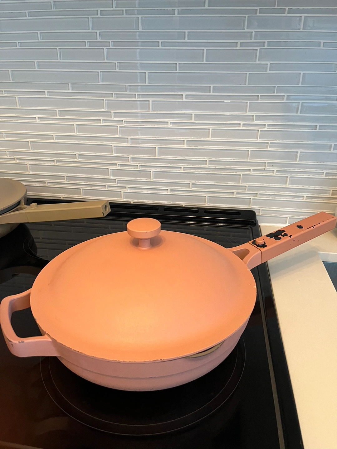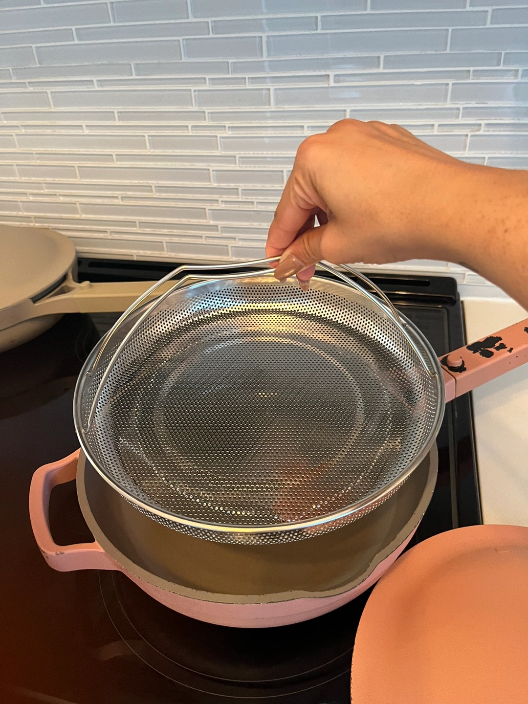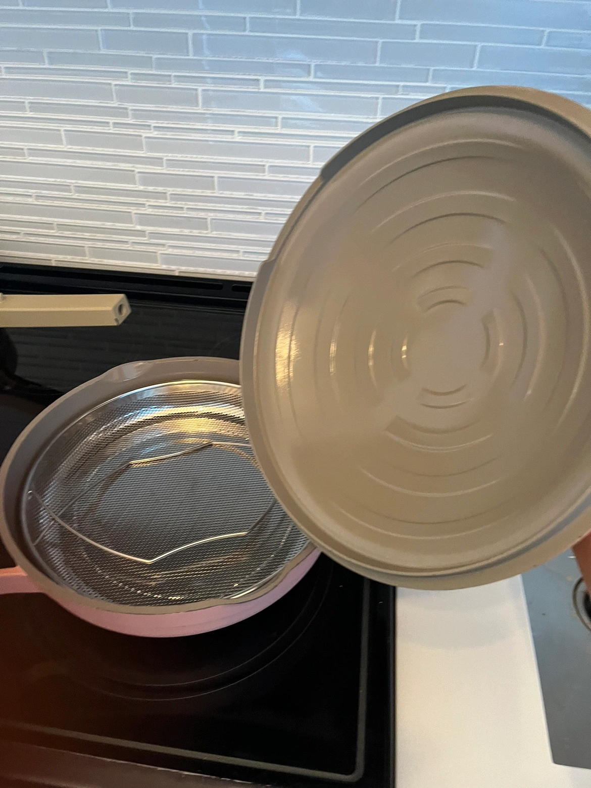 It comes with a lid and a separate steamer insert. It is a great pan for cooking a variety of foods. Has paint chips from dishwasher