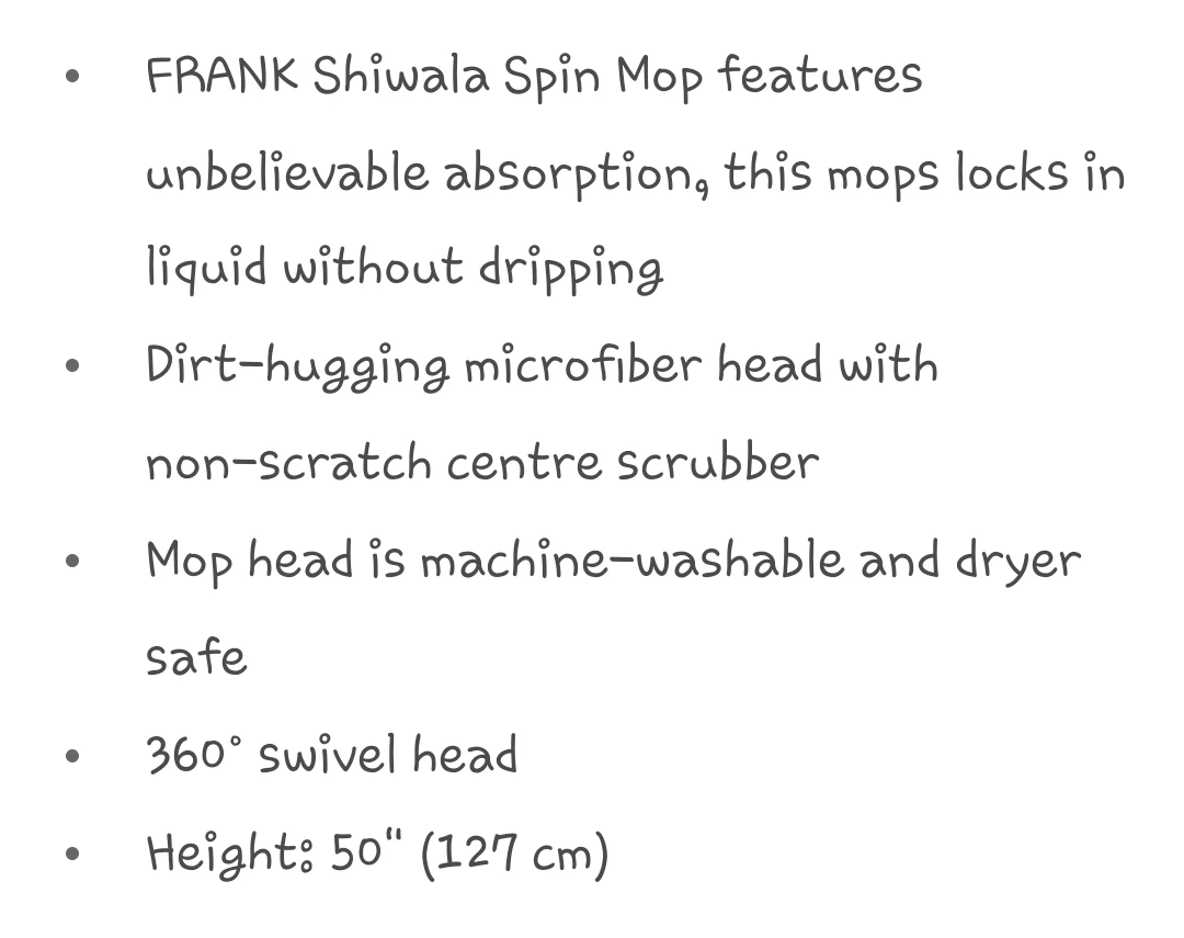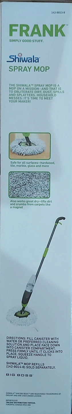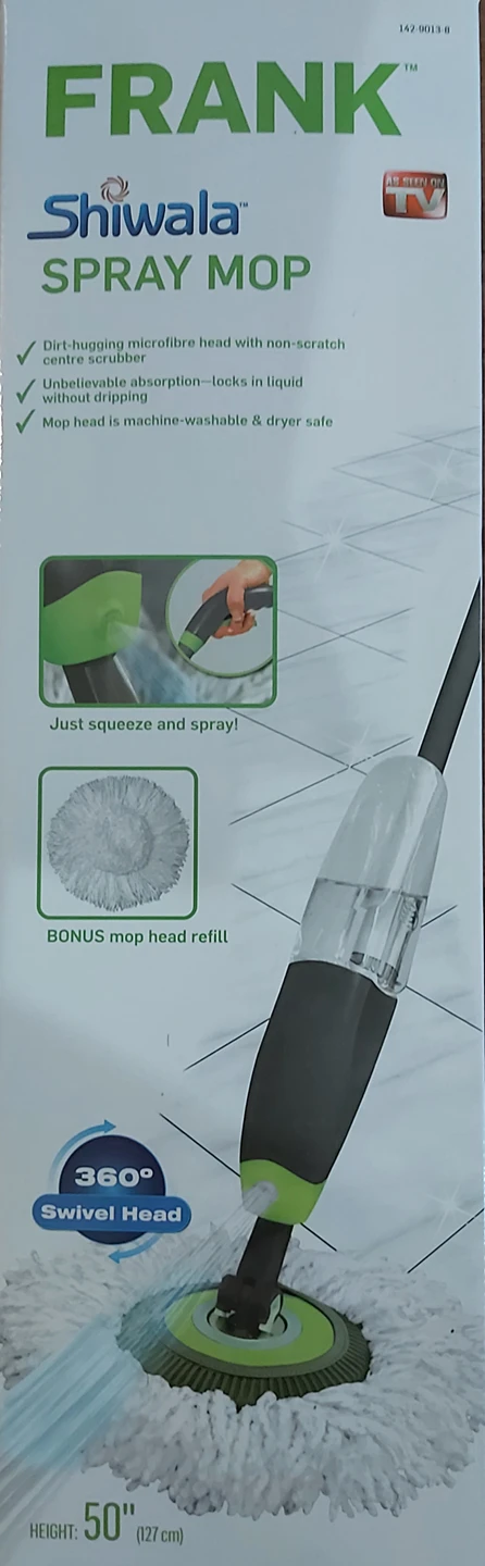 brand new frank shiwala spray mop; never opened, never used retail price:$29.99+tax selling price:$18 (no further negos.) (cash only, no refund) product details: plz see attached pic. pick up around Yonge and Sheppard (at 5:30pm during weekdays)